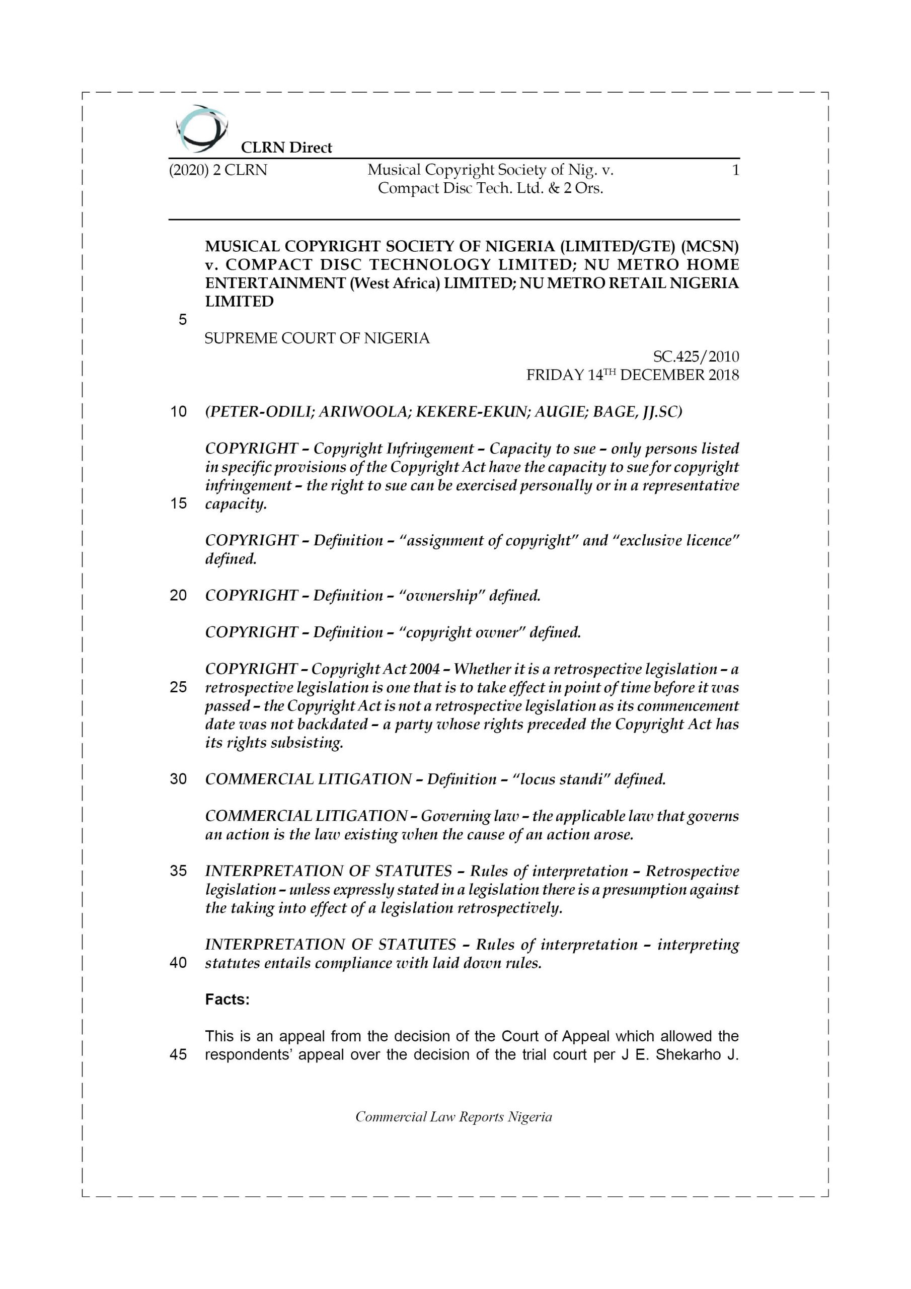 Dissatisfied with the decision of the lower court, the appellant appealed to the Supreme Court seeking for the determination of the court on whether it has the locus standi to sue for copyright infringement against the respondent.