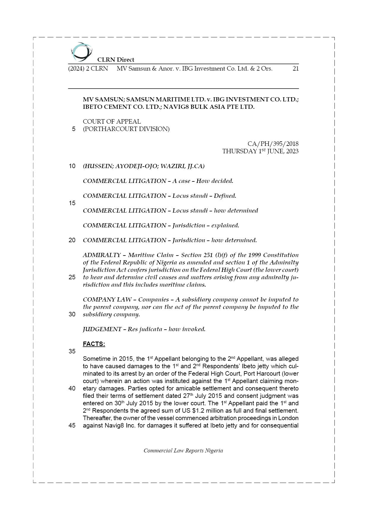 Sometime in 2015, the 1st Appellant belonging to the 2nd Appellant, was alleged to have caused damages to the 1st and 2nd Respondents’ Ibeto jetty which culminated to its arrest by an order of the Federal High Court, Port Harcourt (lower court) wherein an action was instituted against the 1st Appellant claiming monetary damages. Parties opted for amicable settlement and consequent thereto filed their terms of settlement dated 27th July 2015 and consent judgment was entered on 30th July 2015 by the lower court. The 1st Appellant paid the 1st and 2nd Respondents the agreed sum of US $1.2 million as full and final settlement. Thereafter, the owner of the vessel commenced arbitration proceedings in London against Navig8 Inc. for damages it suffered at Ibeto jetty and for consequential settlement sum paid to the 1st and 2nd Respondents. Also, the charterer of the vessel commenced arbitration proceedings in London against Palmex Agencies Nigeria Limited, being the sub-charterer, so as to defray any cost that may be- awarded by the arbitral tribunal against it. By virtue of a time charter-party agreement, Navig8 Inc. chartered the 1st Appellant which it placed in the bulk pool of Navig8 Bulk Pool Inc. and which it subsequently sub-chartered to Palmex Agencies Nigeria Limited.