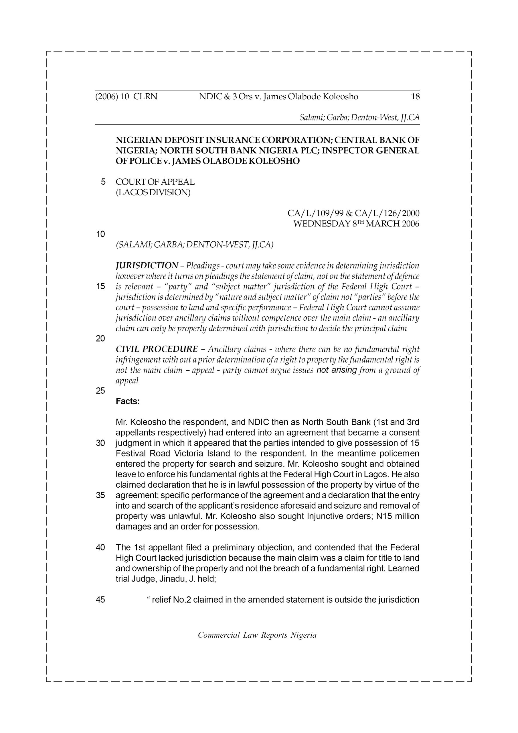 Mr. Koleosho the respondent, and NDIC then as North South Bank (1st and 3rd appellants respectively) had entered into an agreement that became a consent judgment in which it appeared that the parties intended to give possession of 15 Festival Road Victoria Island to the respondent. In the meantime policemen entered the property for search and seizure. Mr. Koleosho sought and obtained leave to enforce his fundamental rights at the Federal High Court in Lagos. He also claimed declaration that he is in lawful possession of the property by virtue of the agreement; specific performance of the agreement and a declaration that the entry into and search of the applicant’s residence aforesaid and seizure and removal of property was unlawful. Mr. Koleosho also sought Injunctive orders; N15 million damages and an order for possession.