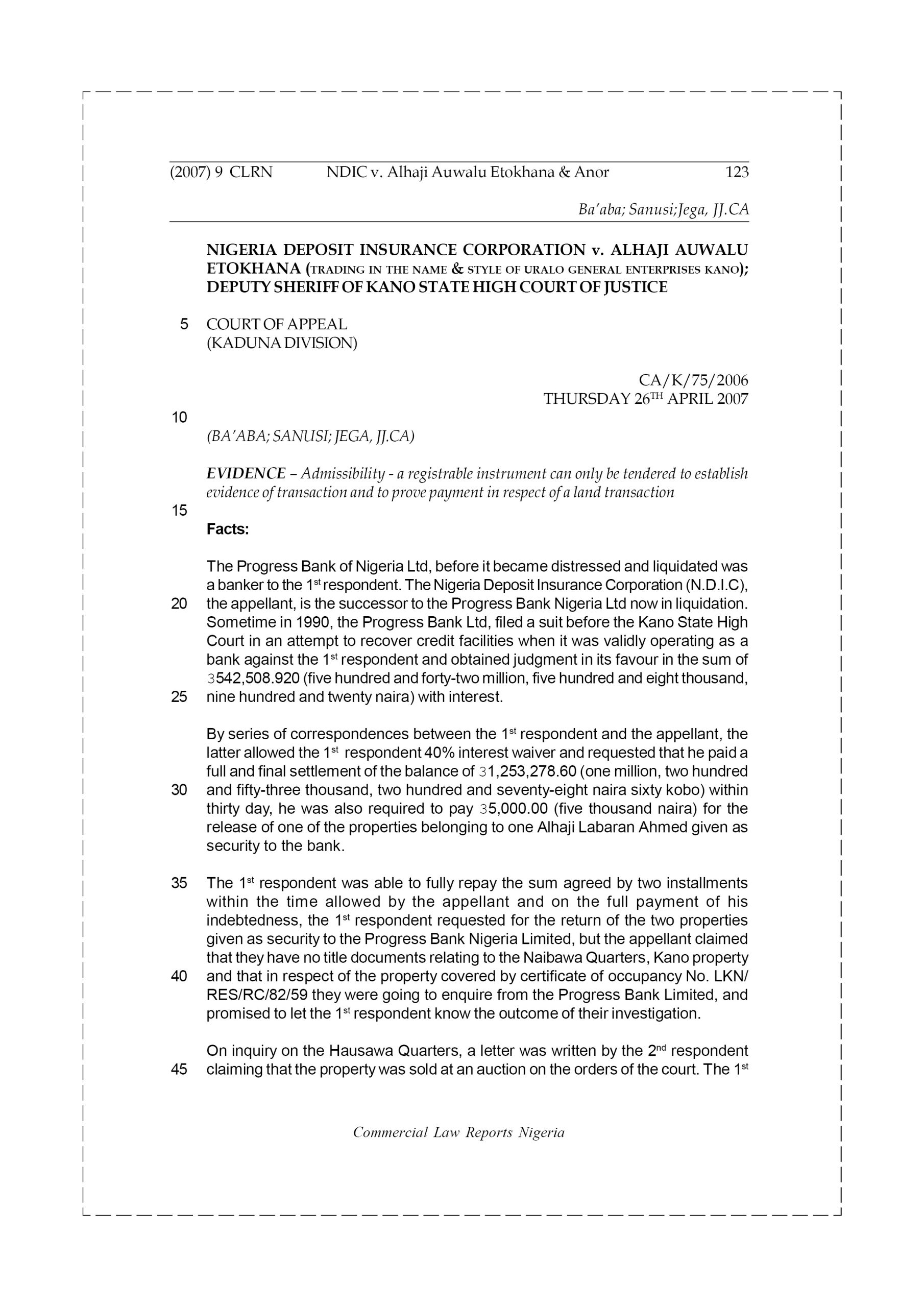 The Progress Bank of Nigeria Ltd, before it became distressed and liquidated was a banker to the 1st respondent. The Nigeria Deposit Insurance Corporation (N.D.I.C), the appellant, is the successor to the Progress Bank Nigeria Ltd now in liquidation. Sometime in 1990, the Progress Bank Ltd, filed a suit before the Kano State High Court in an attempt to recover credit facilities when it was validly operating as a bank against the 1st respondent and obtained judgment in its favour in the sum of N542,508.920 (five hundred and forty-two million, five hundred and eight thousand, nine hundred and twenty naira) with interest.