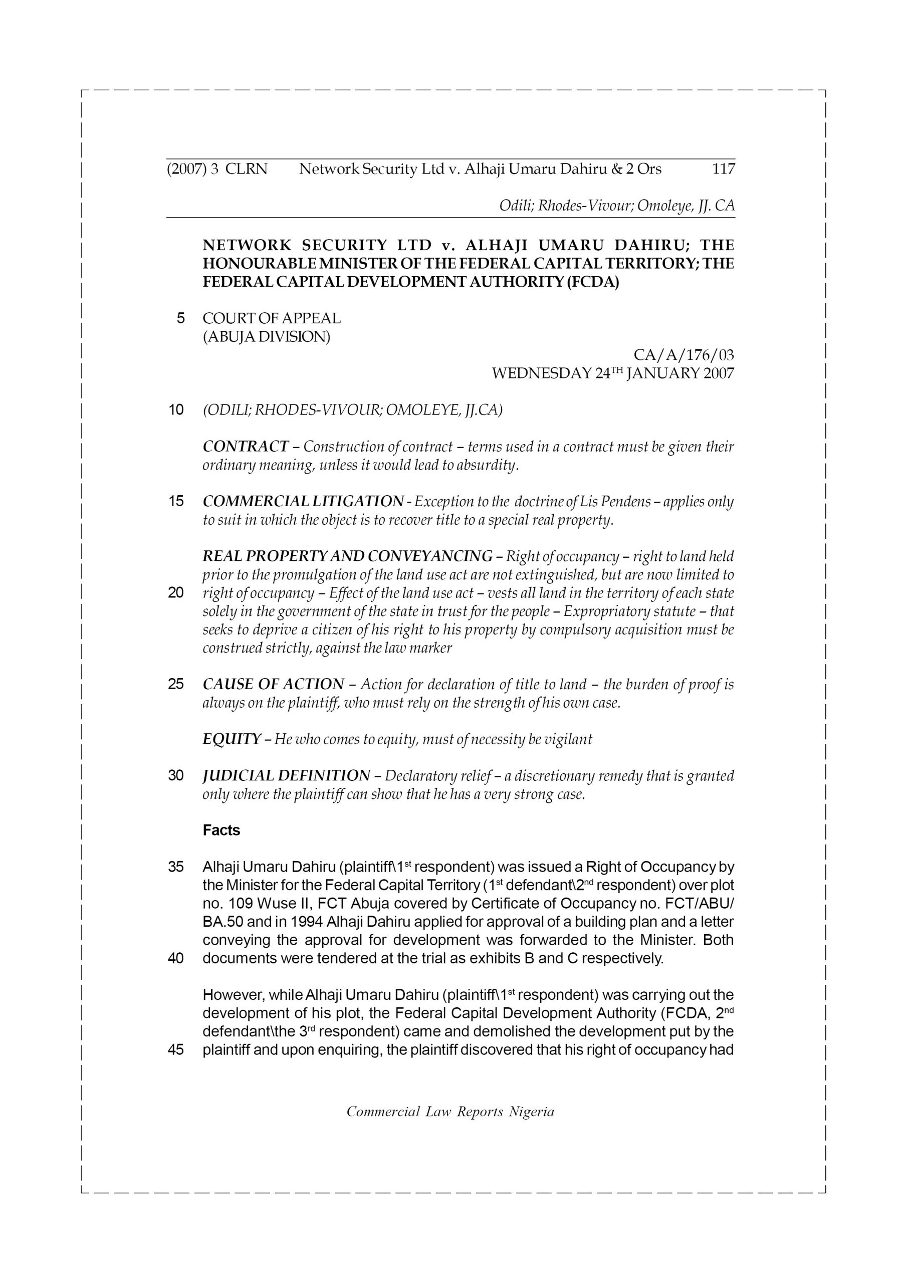However, while Alhaji Umaru Dahiru (plaintiff\1st respondent) was carrying out the development of his plot, the Federal Capital Development Authority (FCDA, 2nd defendant\the 3rd respondent) came and demolished the development put by the plaintiff and upon enquiring, the plaintiff discovered that his right of occupancy had been revoked. He therefore brought an action in the Federal High Court against the Minister, the FCDA and later against the Network Security Limited as the 1st, 2nd and 4th defendants respectively. During the pendency of the suit in the Federal High Court, the FCDA sold the plot in question to the Network Security Limited, who was later joined as the 4th defendant in the suit