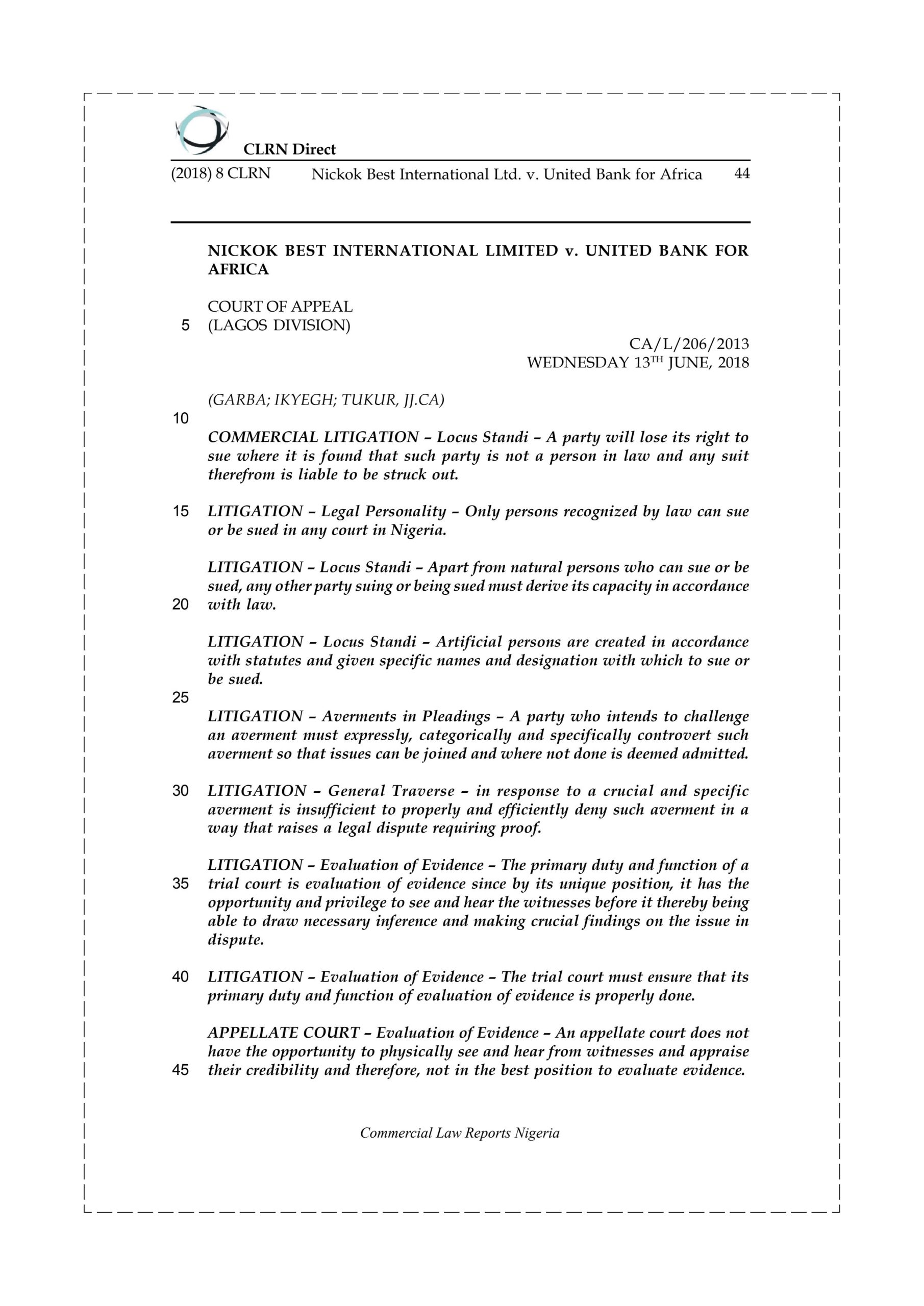 At the trial of the suit, the court raised an issue touching on whether the appellant is a juristic person in law capable of suing or be sued. The court resolved the issue by stating that the appellant failed to establish that it is a person in law duly registered under Nigerian law and as such lacks the capacity to sue. The court went further to strike out the counter claim on the ground that the suit was incompetent for lack of juristic capacity to sue. The appellant was dissatisfied with the decision of the trial court and consequently filed a notice of appeal at the Court of Appeal, Lagos Division urging it to reverse the trial court.