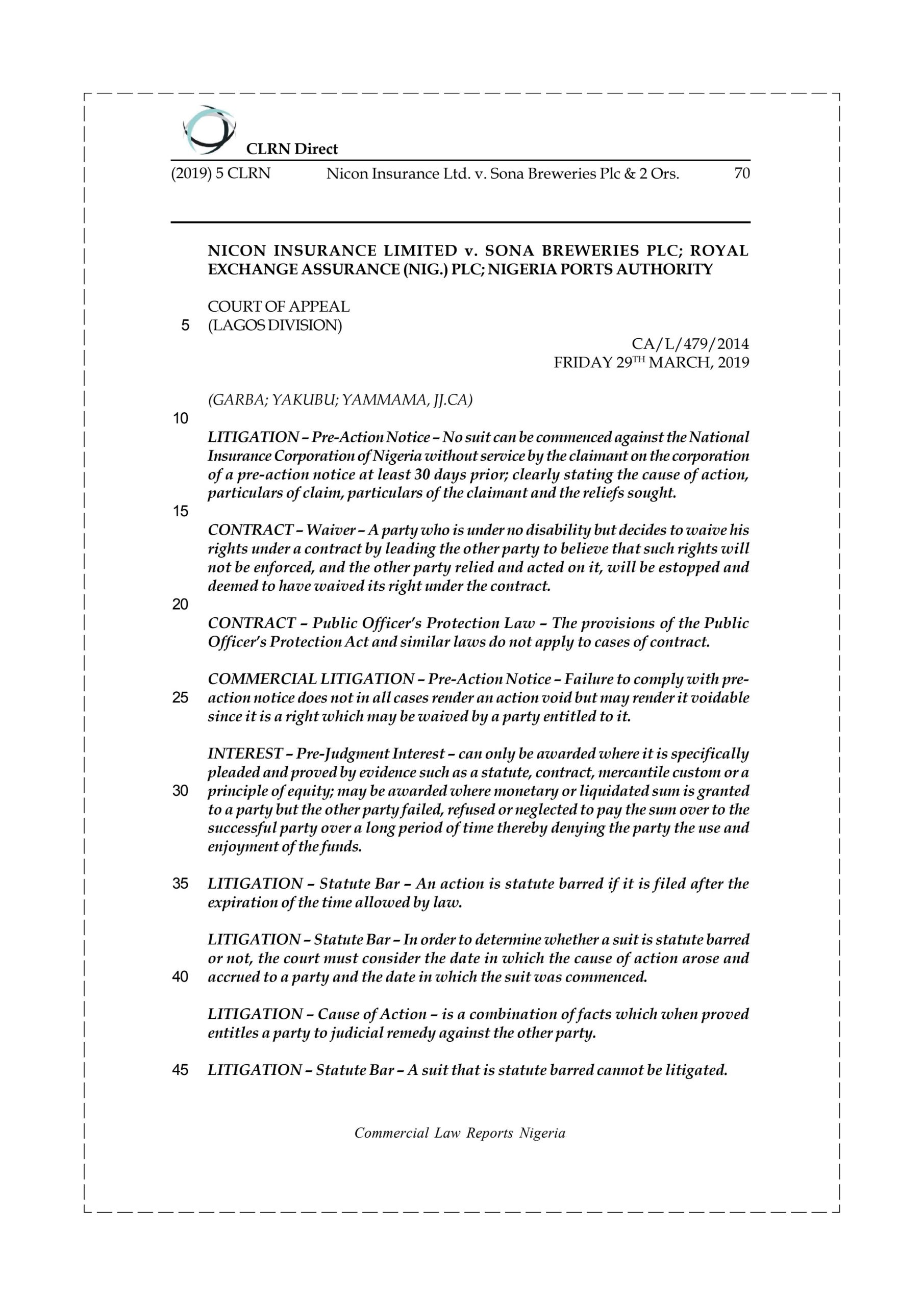 The 1st respondent is an insurance policy holder with the 2nd respondent. The policy covered certain risks concerning the business equipment of the 1st respondent. The 3rd respondent is a Federal Government agency responsible for the management of Nigerian Ports. The appellant is the insurer of the 3rd respondent. The 1st respondent alleged that the 3rd respondent vandalized its 1250 KVA Gas Generator and Sync Panel which was in its possession, which was part of the 1st respondent’s consignment. The 3rd respondent admitted liability and consequently informed the 1st respondent to make a claim with the appellant for indemnity. The 1st respondent made a claim to the 2nd respondent for the sum of N14,044,210.00 (Fourteen Million, Forty Four Thousand, Two Hundred and Ten Naira) being the value of the missing spare parts from the vandalized 1250 KVA Gas Generator and Sync Panel.