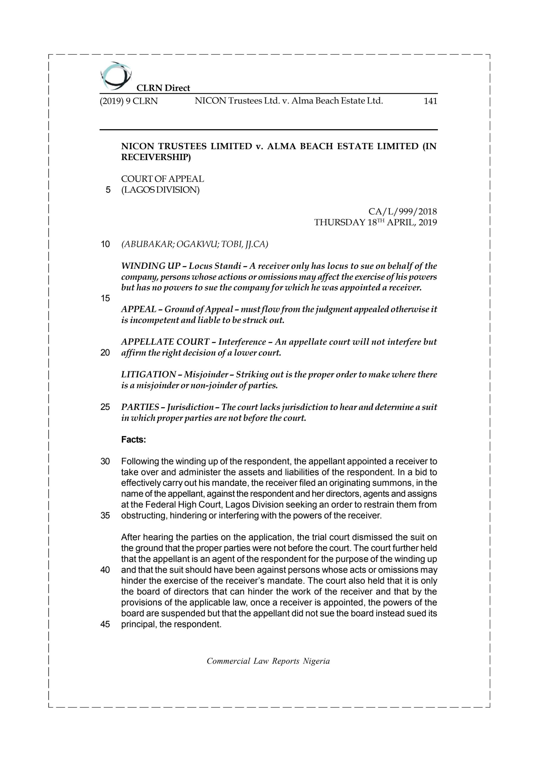 After hearing the parties on the application, the trial court dismissed the suit on the ground that the proper parties were not before the court. The court further held that the appellant is an agent of the respondent for the purpose of the winding up and that the suit should have been against persons whose acts or omissions may hinder the exercise of the receiver’s mandate. The court also held that it is only the board of directors that can hinder the work of the receiver and that by the provisions of the applicable law, once a receiver is appointed, the powers of the board are suspended but that the appellant did not sue the board instead sued its principal, the respondent.