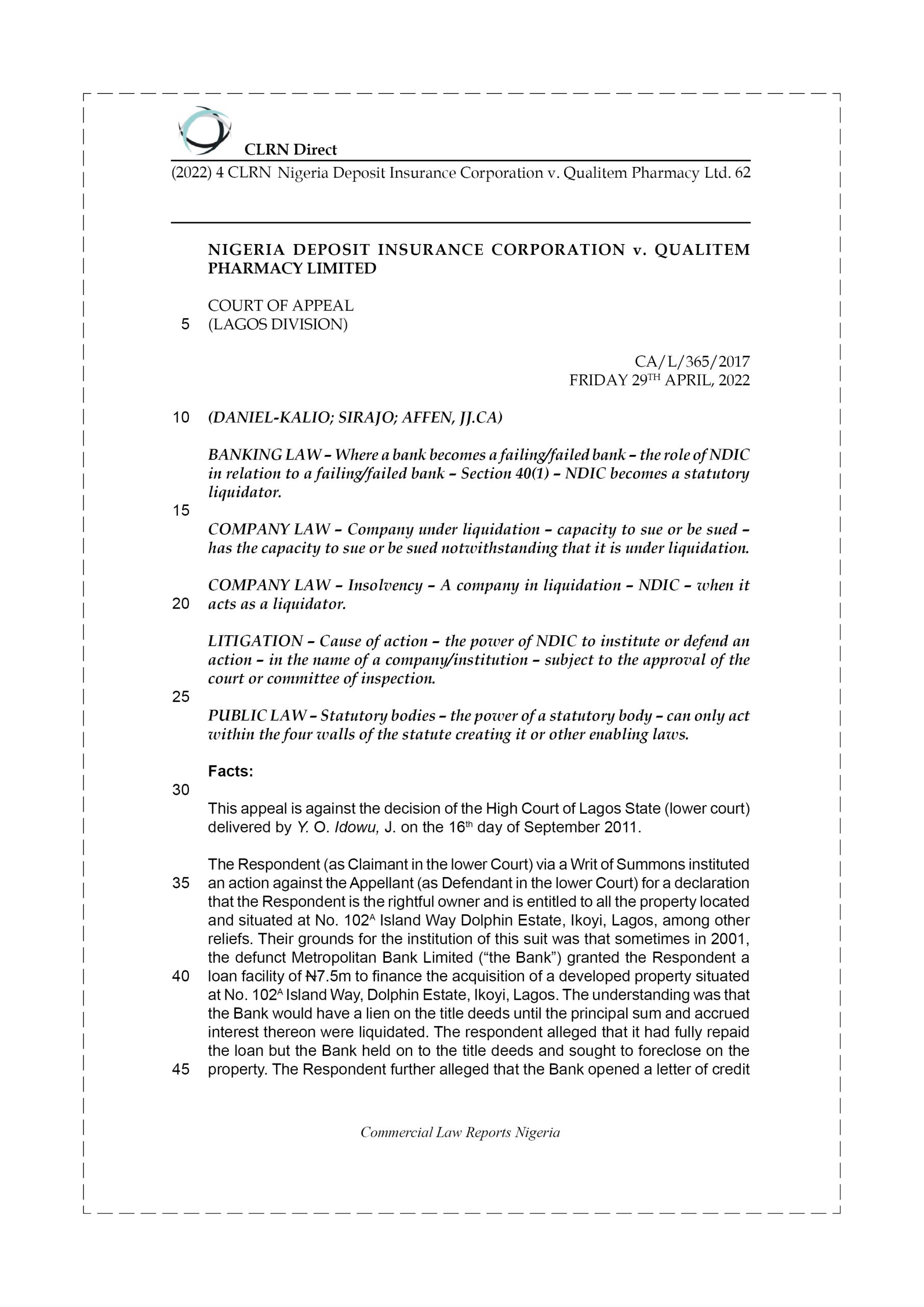 Issues were joined on the merits, with the Bank conceding the fact that the Dutch Auction System did not have a retroactive effect, but denied that there was mutual agreement on all terms and conditions, particularly in relation to the exchange rate. The Bank equally denied that the loan was fully repaid as alleged or at all, and to this effect filed a counterclaim against the Respondent. Into the course of the proceeding, the Bank’s licence was revoked by the Central Bank of Nigeria, and the revocation was further published in Official Gazette, whereupon the Respondent applied ex parte to substitute the Bank with NDIC, who was appointed as the liquidator, of which application was granted by the lower Court. NDIC did not challenge the order of substitution or otherwise seek to set it aside. Rather, it proceeded to file a further amended statement of defence and counterclaim.