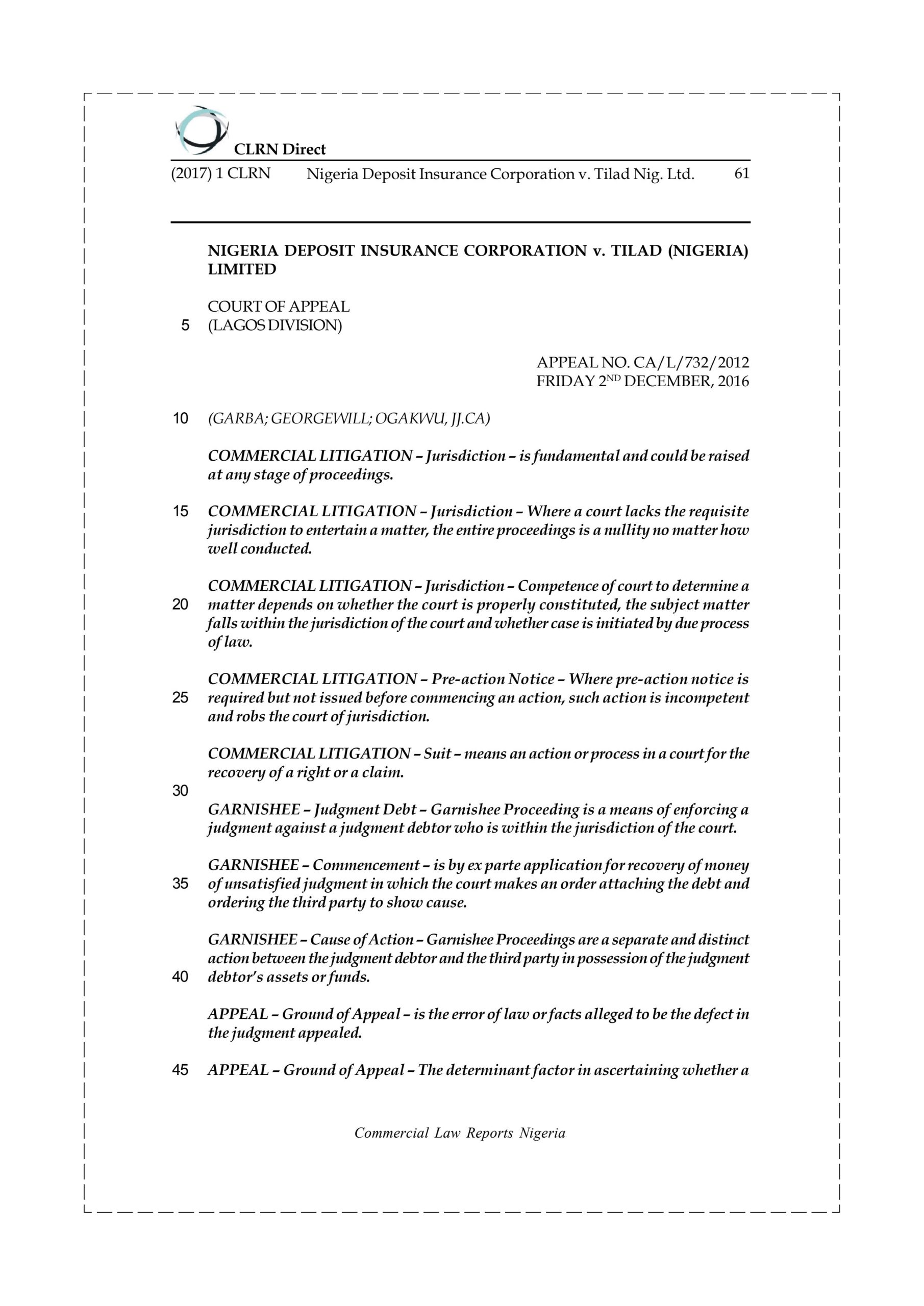 After it was served with the garnishee order nisi, the appellant filed a notice of preliminary objection challenging the jurisdiction of the court on the ground that the respondent ought to have issued a pre-action notice before commencing the suit but failed to do so. The court dismissed the preliminary objection after hearing both parties. The appellant was dissatisfied with the judgment and filed a notice of appeal at the Court of Appeal, Lagos Division.