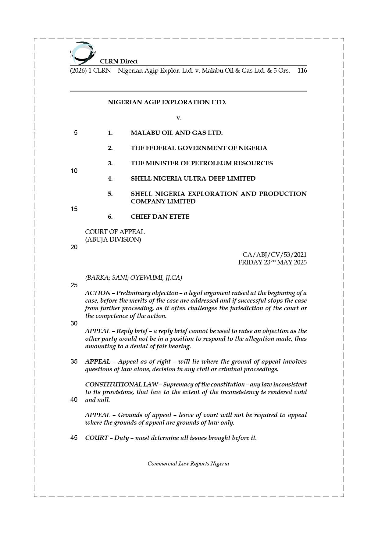 NIGERIAN AGIP EXPLOR. LTD. v. MALABU OIL & GAS LTD. & 5 ORS.