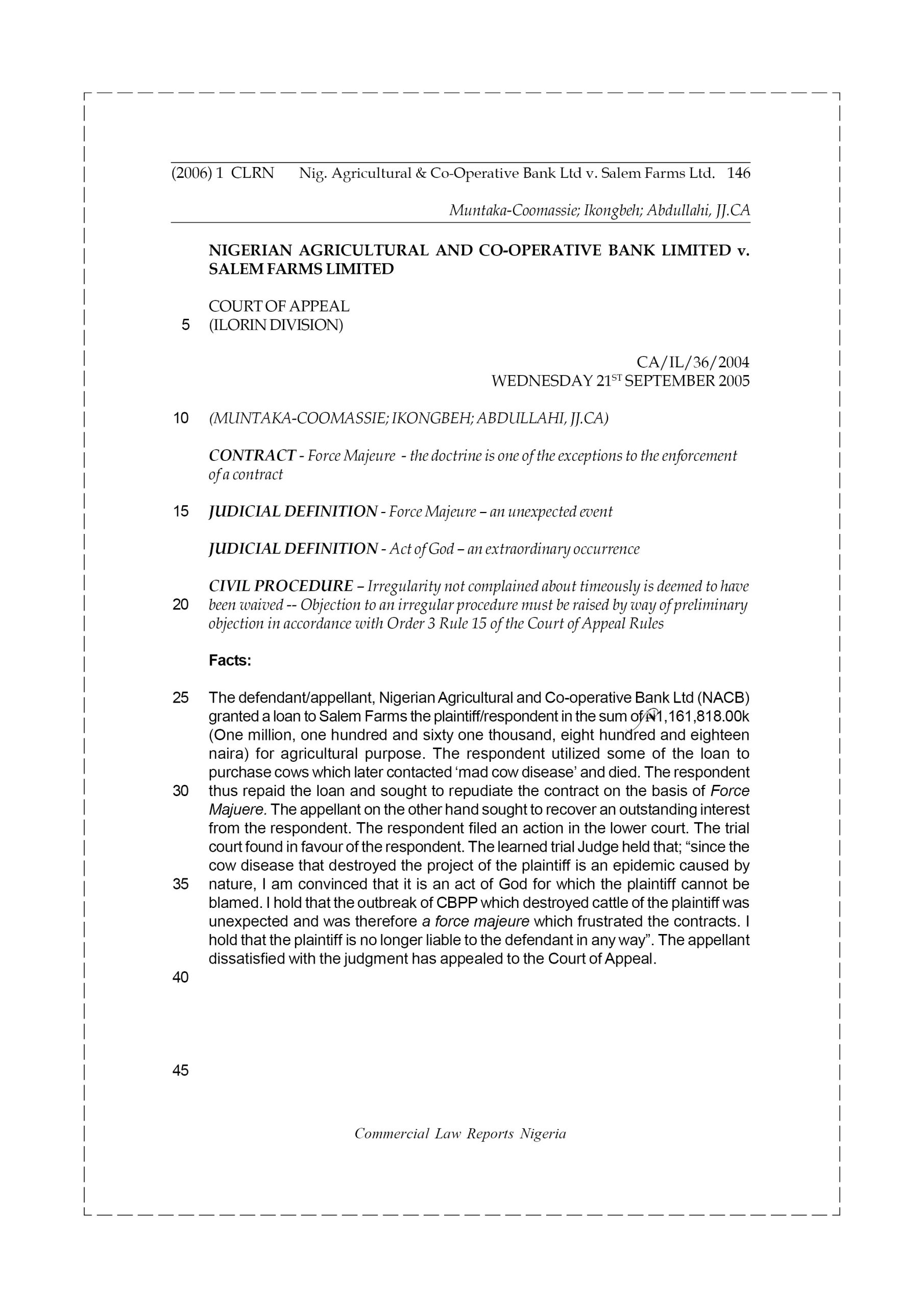 The defendant/appellant, Nigerian Agricultural and Co-operative Bank Ltd (NACB) granted a loan to Salem Farms the plaintiff/respondent in the sum of N1,161,818.00k (One million, one hundred and sixty one thousand, eight hundred and eighteen naira) for agricultural purpose. The respondent utilized some of the loan to purchase cows which later contacted ‘mad cow disease’ and died. The respondent thus repaid the loan and sought to repudiate the contract on the basis of Force Majuere. The appellant on the other hand sought to recover an outstanding interest from the respondent. The respondent filed an action in the lower court. The trial court found in favour of the respondent. The learned trial Judge held that; “since the cow disease that destroyed the project of the plaintiff is an epidemic caused by nature, I am convinced that it is an act of God for which the plaintiff cannot be blamed. I hold that the outbreak of CBPP which destroyed cattle of the plaintiff was unexpected and was therefore a force majeure which frustrated the contracts. I hold that the plaintiff is no longer liable to the defendant in any way”. The appellant dissatisfied with the judgment has appealed to the Court of Appeal.