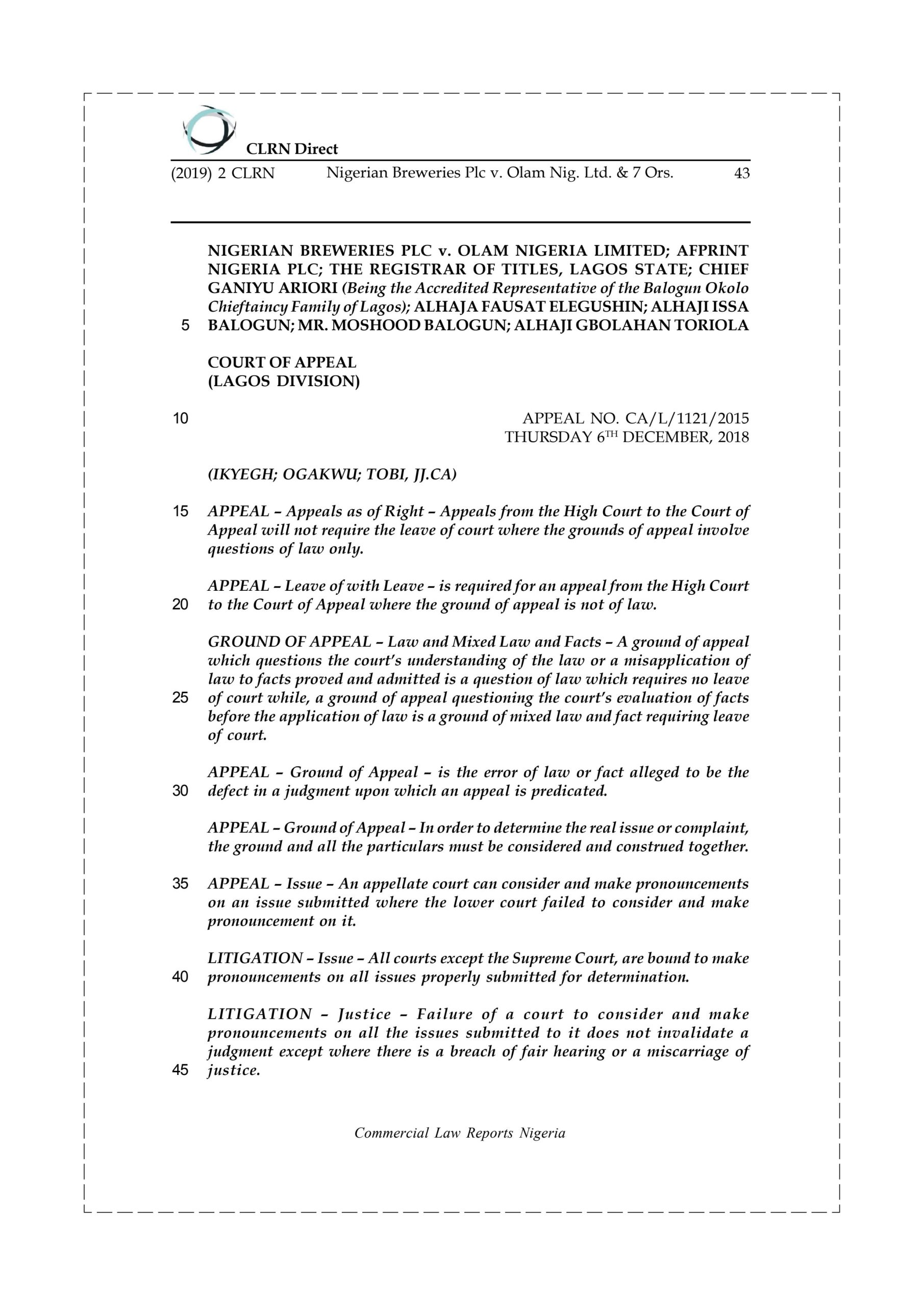 After being served with the originating process, the 1st and 2nd respondents filed their defence in which they averred that the lease agreement between the parties had been transferred to the appellant. They consequently, filed an application for joinder of the appellant as a co-defendant to the suit. After hearing it, the High Court granted the application and joined the appellant. The appellant was dissatisfied with the ruling of the court and filed a notice of appeal at the Court of Appeal, Lagos Division.