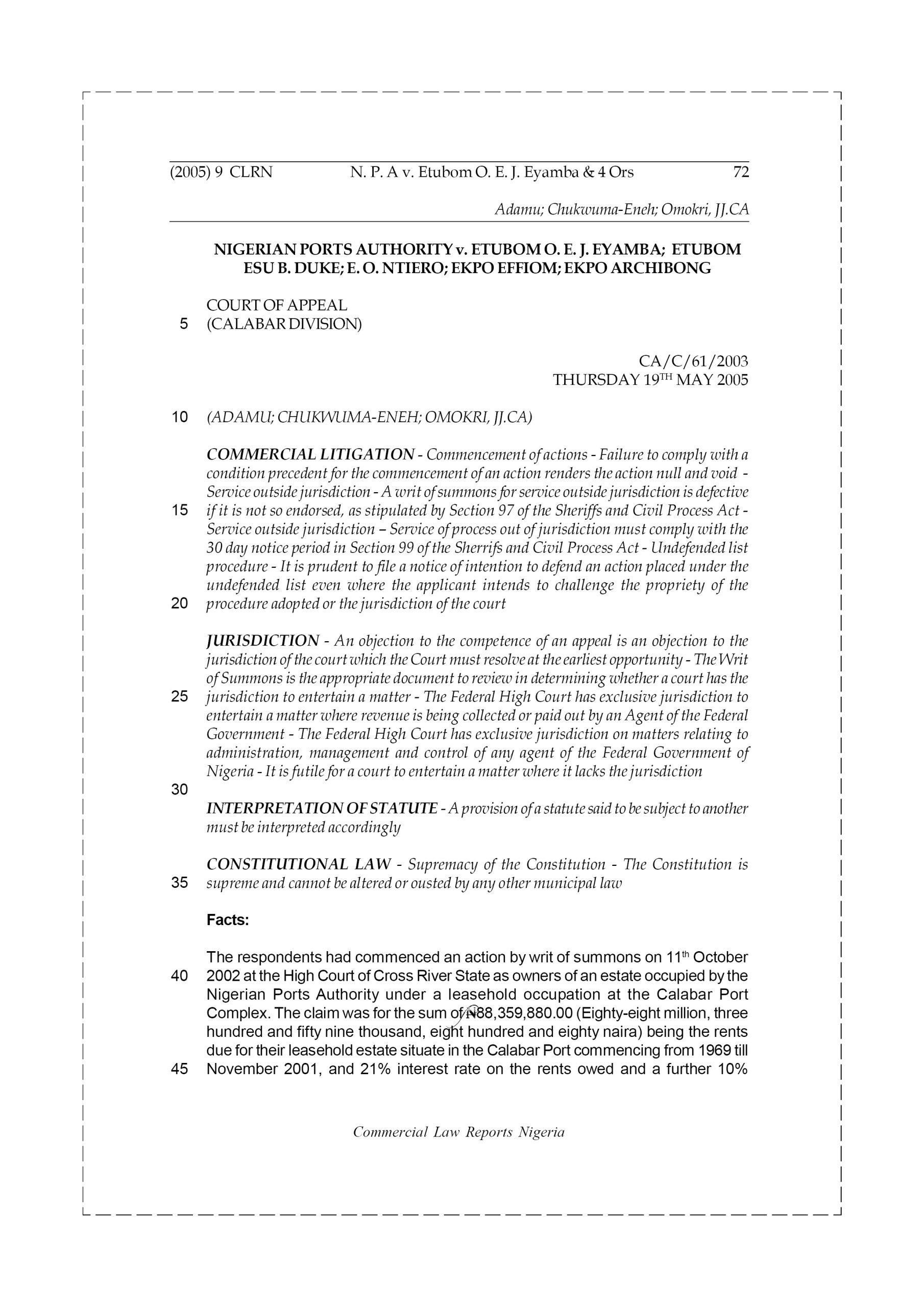 The respondents had commenced an action by writ of summons on 11th October 2002 at the High Court of Cross River State as owners of an estate occupied by the Nigerian Ports Authority under a leasehold occupation at the Calabar Port Complex. The claim was for the sum of N88,359,880.00 (Eighty-eight million, three hundred and fifty nine thousand, eight hundred and eighty naira) being the rents due for their leasehold estate situate in the Calabar Port commencing from 1969 till November 2001, and 21% interest rate on the rents owed and a further 10% interest on the judgment sum until final liquidation. The respondents also claimed the sum of N200,000.00 (Two hundred thousand naira) as cost of making the claim including legal fees.