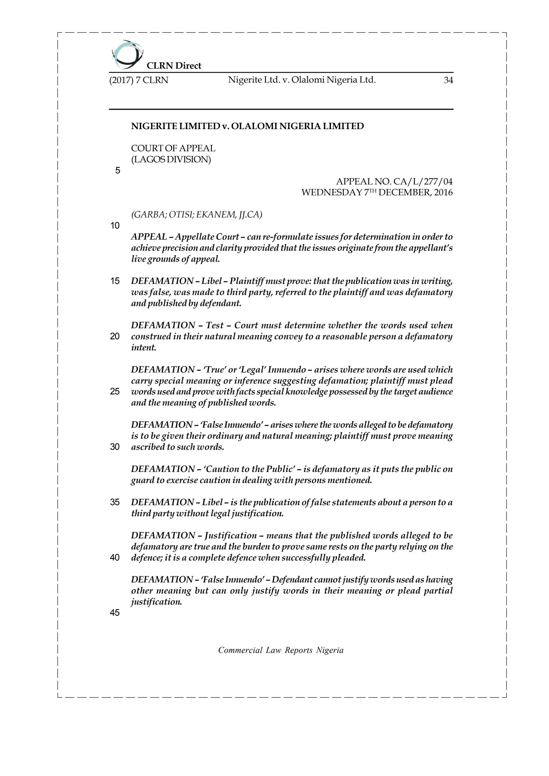 The respondent filed its action at the High Court of Lagos State alleging that the words published by the respondent caused injury to its business reputation. The words alleged to be defamatory were interpreted into English language from Yoruba, the language of publication suggesting that the respondent no longer sells quality products of the appellant and cautioning roofing carpenters, Nigerite dealers and the general public to beware. The appellant also listed the outlets of the respondent in the advert stating that its quality products cannot be bought in the locations listed. The respondent alleged that the said advert is suggestive of the fact that it does not sell original but fake products.