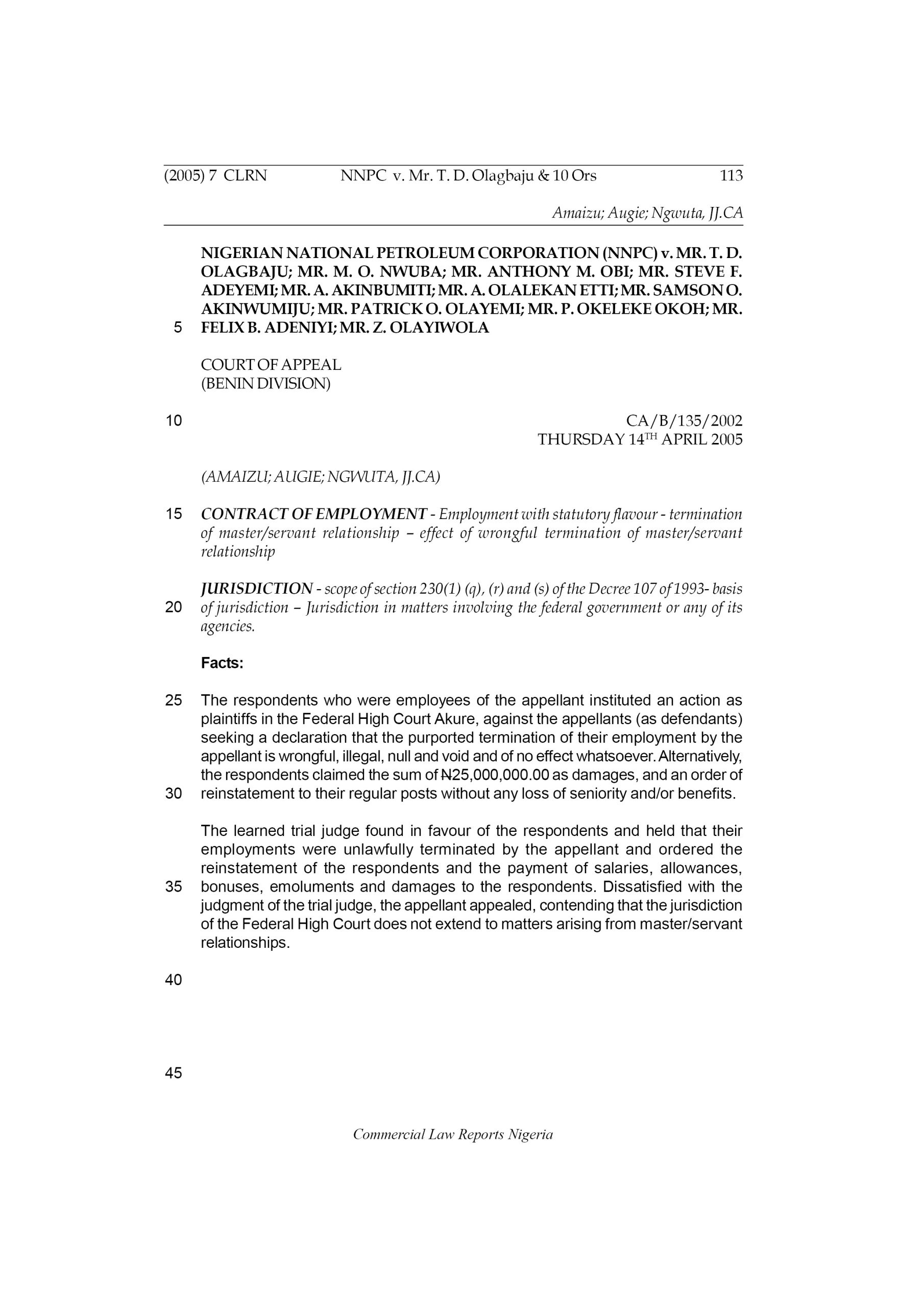 The respondents who were employees of the appellant instituted an action as plaintiffs in the Federal High Court Akure, against the appellants (as defendants) seeking a declaration that the purported termination of their employment by the appellant is wrongful, illegal, null and void and of no effect whatsoever. Alternatively, the respondents claimed the sum of N25,000,000.00 as damages, and an order of reinstatement to their regular posts without any loss of seniority and/or benefits.