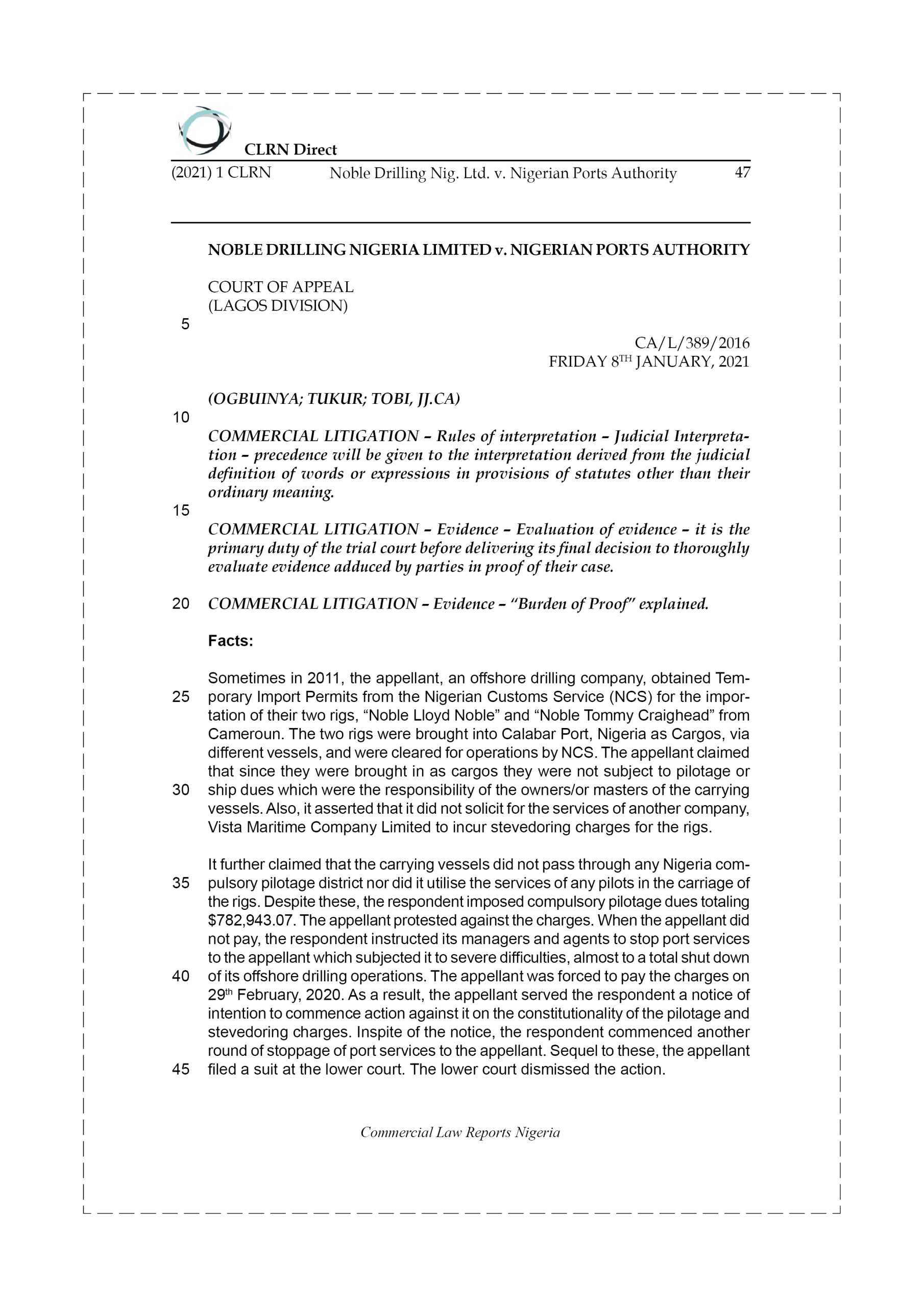 Sometimes in 2011, the appellant, an offshore drilling company, obtained Temporary Import Permits from the Nigerian Customs Service (NCS) for the importation of their two rigs, “Noble Lloyd Noble” and “Noble Tommy Craighead” from Cameroun. The two rigs were brought into Calabar Port, Nigeria as Cargos, via different vessels, and were cleared for operations by NCS. The appellant claimed that since they were brought in as cargos they were not subject to pilotage or ship dues which were the responsibility of the owners/or masters of the carrying vessels. Also, it asserted that it did not solicit for the services of another company, Vista Maritime Company Limited to incur stevedoring charges for the rigs.