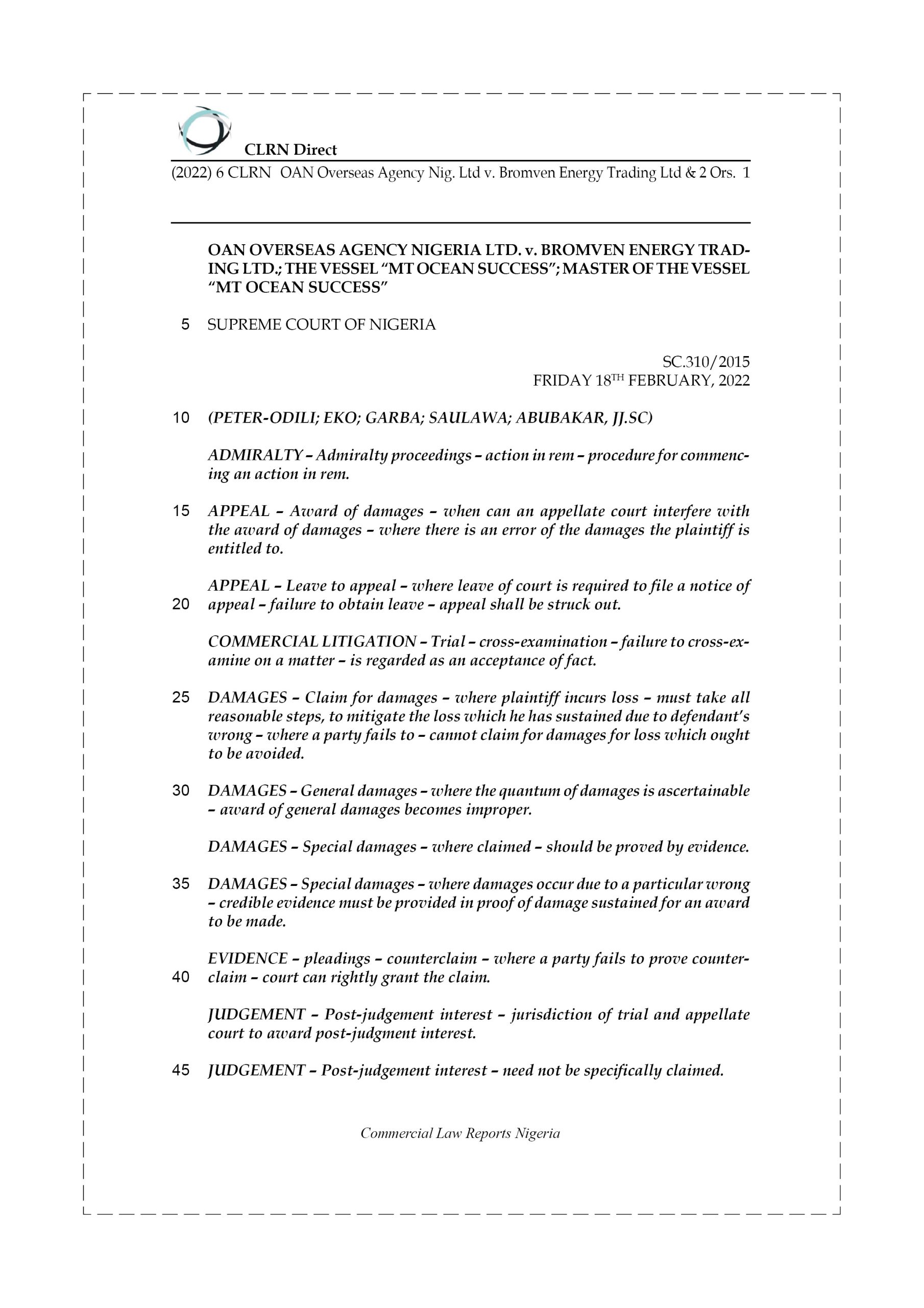 The Appellant (Plaintiff) via a writ of summons and statement of claim commenced an admiralty action against the Respondents (Defendants) at the Federal High Court, Lagos (trial Court), claiming the sum of United States Dollars $1,986,939.97 as an outstanding debt against the 1st Respondent for port and cargo dues and ships charges and agency fees. The appellant also claimed interest on the said sum of United States Dollars $1,986,939.97. The Appellant also filed a motion ex-parte requesting an Order of arrest/detention of the Vessel MT “Ocean Success” and the Cargo of 15,300 MT of premium Motor Spirit (PMS) on board the Vessel MT “Ocean Success” both being the only known assets of the 1st Respondent within jurisdiction in the reasonable contemplation of the Appellant at the time of commencement of the proceedings at the trial Court, of which the trial Court granted pending the provision of a bank guarantee from a reputable Bank in Nigeria to secure the claim of the Appellant. Flowing from this, the 1st Respondent filed an application for the release of the MT “Ocean Success” and Cargo of 15,300 MT of Premium Motor Spirit on board the vessel which were detained pursuant to the Order of the trial Court. The 1st Respondent also provided a bank guarantee from Ecobank of Nigeria Plc. to secure the claim of the appellant at the trial Court, and on this basis, both the vessel, MT “Ocean Success” and Cargo of Premium Motor Spirit (PMS) were released from arrest. The 1st Respondent subsequently filed a statement of defence and counterclaimed for the sum of US$400,000.00 being charter costs for the 5 days for which the ship was arrested at the rate of US$80,000.00 per day; US$9,500.00 being the cost of issuing Bank Guarantee and interest of 18% being Central Bank of Nigeria official rate on the said sum, and post-judgment interests on the sums claimed.