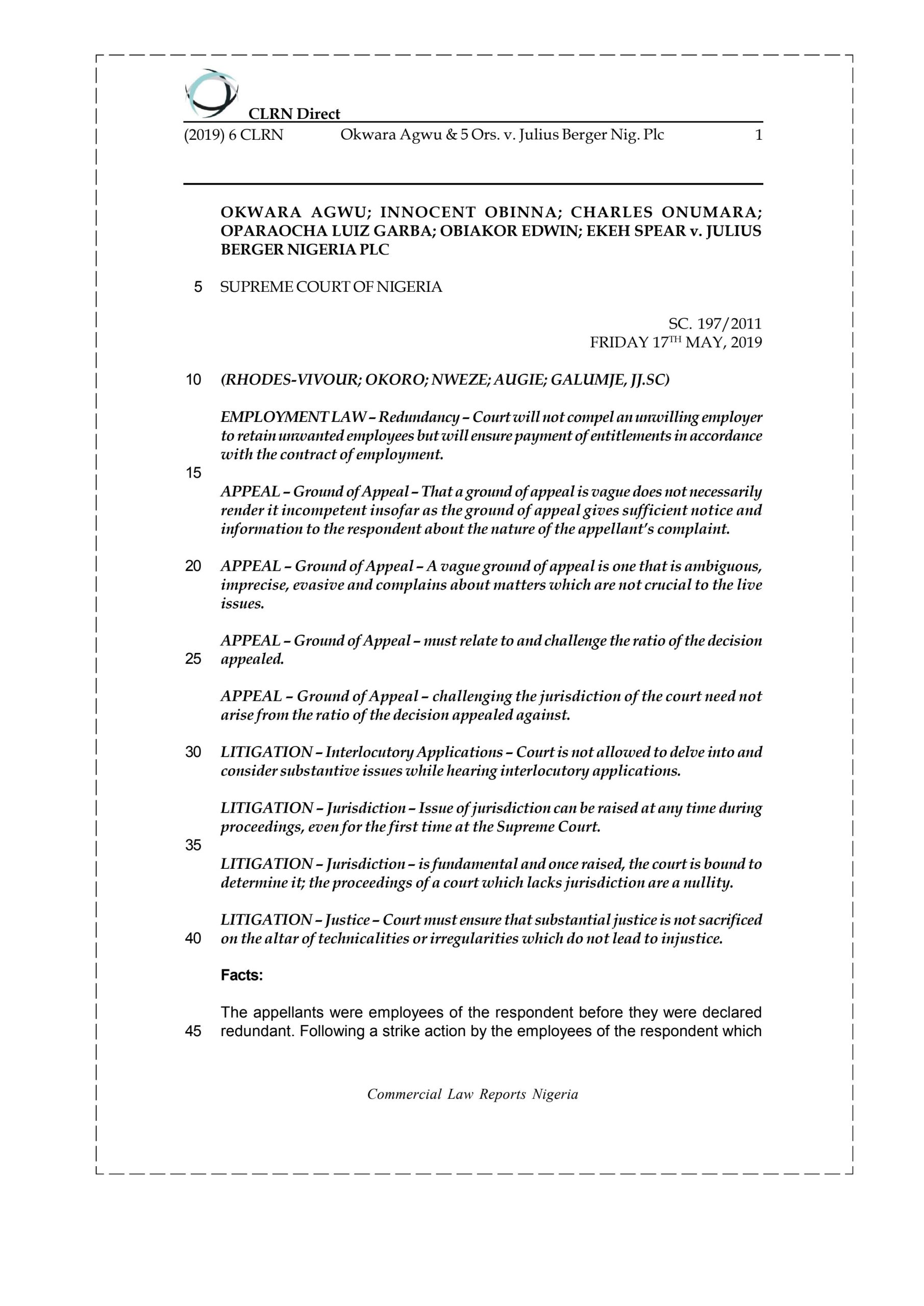 The respondent, nonetheless, went ahead to declare the workers redundant and paid them their entitlements. The appellants commenced contempt proceedings against the respondent but they were unsuccessful. On the 4th of October, 2000 the appellants filed a motion at the same court against the respondent for orders reinstating the workers declared redundant pending the determination of the suit and deeming the appellants as employees of the respondent at all material time from the commencement of the suit. The respondent challenged the motion by filing a counter affidavit. In its ruling on the 30th of May, 2001 the judge ruled that the respondent acted illegally by declaring the workers redundant after the filing of the suit and that the employees are deemed to be in the employment of the respondent pending the determination of the suit. The court further ruled that all monies paid as entitlement to the workers be refunded to the respondent and that parties should maintain status quo ante bellum. The respondent was dissatisfied with the ruling of the court and consequently filed a notice of appeal at the Court of Appeal, Abuja Division. The appellants too, were dissatisfied with a portion of the ruling and so filed their own appeal.