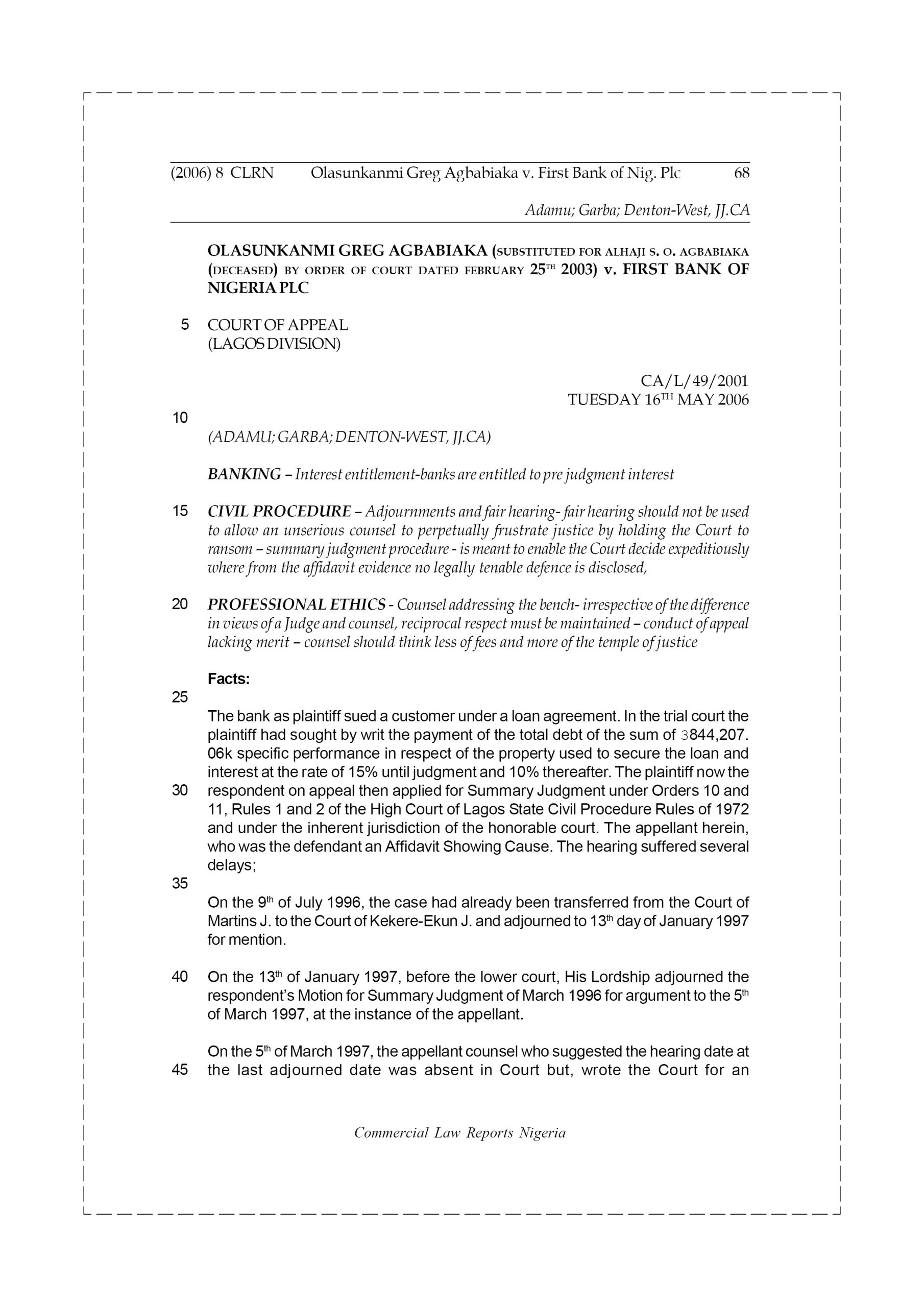 The bank as plaintiff sued a customer under a loan agreement. In the trial court the plaintiff had sought by writ the payment of the total debt of the sum of N844,207. 06k specific performance in respect of the property used to secure the loan and interest at the rate of 15% until judgment and 10% thereafter. The plaintiff now the respondent on appeal then applied for Summary Judgment under Orders 10 and 11, Rules 1 and 2 of the High Court of Lagos State Civil Procedure Rules of 1972 and under the inherent jurisdiction of the honorable court. The appellant herein, who was the defendant an Affidavit Showing Cause. The hearing suffered several delays;