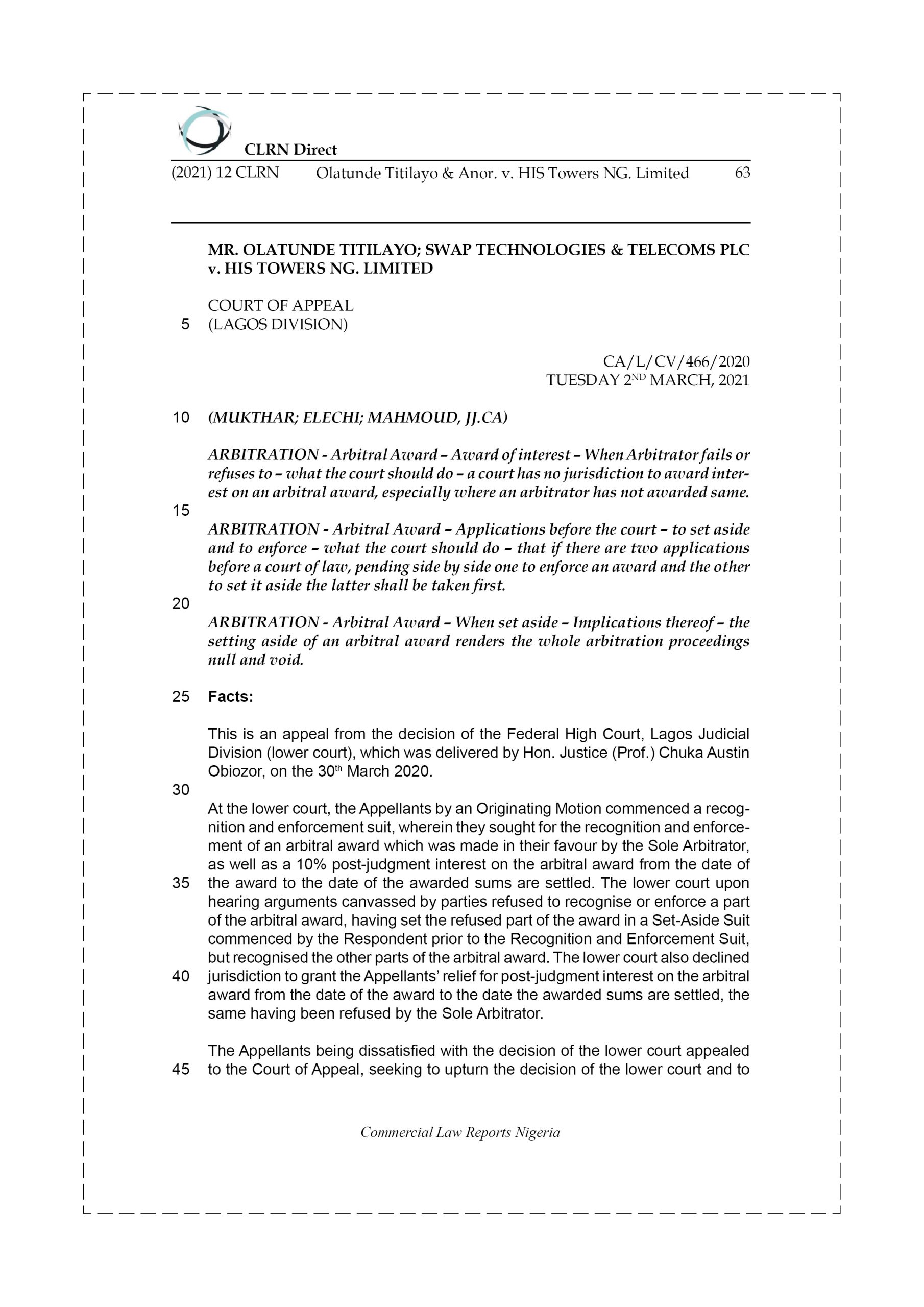 The Appellants being dissatisfied with the decision of the lower court appealed to the Court of Appeal, seeking to upturn the decision of the lower court and to recognise the portion of the award, that had been set, aside by the lower court and for the grant of post-judgment interest on the arbitral award.