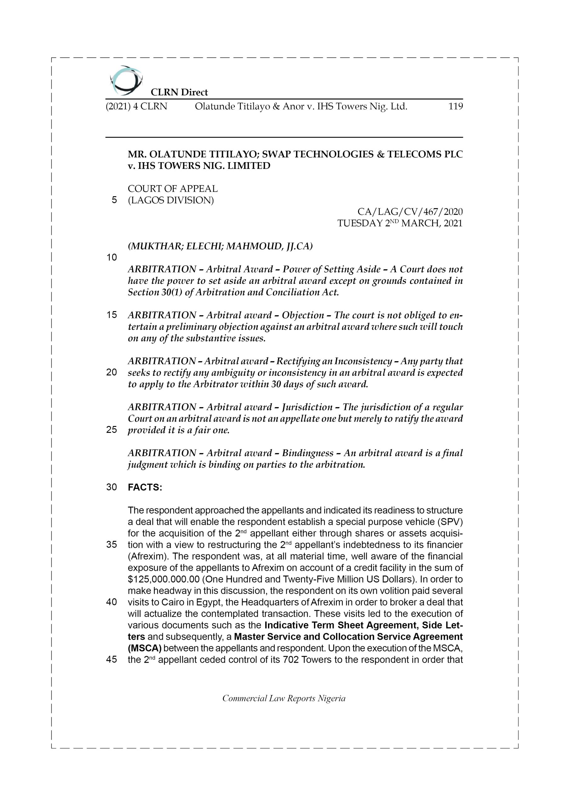 In order to make headway in this discussion, the respondent on its own volition paid several visits to Cairo in Egypt, the Headquarters of Afrexim in order to broker a deal that will actualize the contemplated transaction. These visits led to the execution of various documents such as the Indicative Term Sheet Agreement, Side Letters and subsequently, a Master Service and Collocation Service Agreement (MSCA) between the appellants and respondent. Upon the execution of the MSCA, the 2nd appellant ceded control of its 702 Towers to the respondent in order that the contemplated transaction in the MSCA will be actualized. 15 months into the operation of the MSCA, the respondent abandoned the intended transaction with grave consequence on the astronomical increase in the 2nd appellant’s financial obligation to Afrexim on account of the said facility. Thereafter, the Federal High Court (coram I.N. Buba J.) recommended Mr. Olatunde Busari SAN, FCIS. C. Arb. (UK) to the parties as sole arbitrator and both parties unanimously agreed on his appointment.