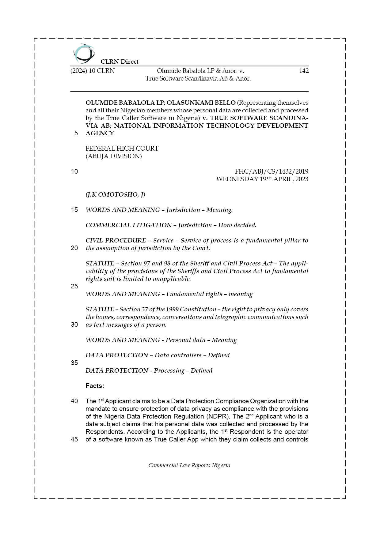 The 1st Applicant claims to be a Data Protection Compliance Organization with the mandate to ensure protection of data privacy as compliance with the provisions of the Nigeria Data Protection Regulation (NDPR). The 2nd Applicant who is a data subject claims that his personal data was collected and processed by the Respondents. According to the Applicants, the 1st Respondent is the operator of a software known as True Caller App which they claim collects and controls over 150 million persons including 2nd Applicant. The Applicants stated that the 1st Respondent uses the True Caller app to harvest telephone numbers of users around the world and makes them available to users of their software all over the world with the 2nd Applicant’s consent. The Applicants believe that the exposure of their telephone numbers to third parties without their consent has caused and will likely cause interference with their telephone conversations as they are likely to receive calls from unknown persons who got their number from the software. That the harvesting of phone number through the phone contact list of users is an invasion of their privacy contrary to section 37 of the Constitution of the Federal Republic of Nigeria, 1999 (as amended) and Regulation 2.1 and 2.3 of the Nigeria Data Protection Regulation i sued by 2nd Respondent on the 25th of January, 2019 pursuant to section 37 of the Constitution. The Applicants therefore urged the Court to intervene on their behalf.
