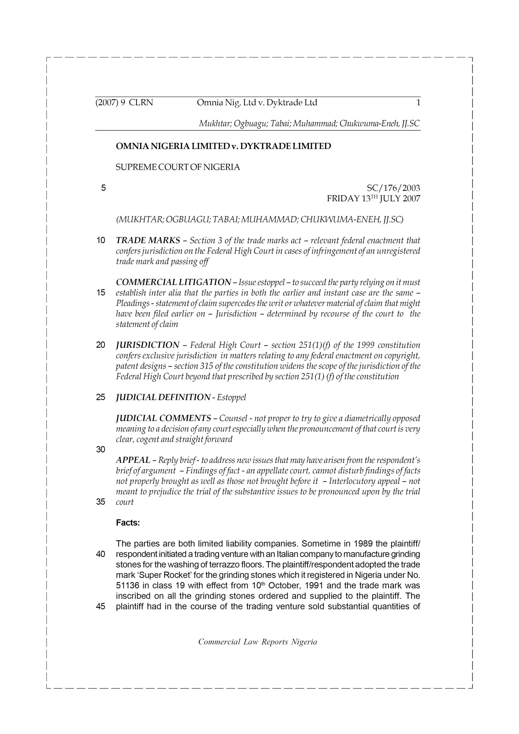 The parties are both limited liability companies. Sometime in 1989 the plaintiff/respondent initiated a trading venture with an Italian company to manufacture grinding stones for the washing of terrazzo floors. The plaintiff/respondent adopted the trade mark ‘Super Rocket’ for the grinding stones which it registered in Nigeria under No. 51136 in class 19 with effect from 10th October, 1991 and the trade mark was inscribed on all the grinding stones ordered and supplied to the plaintiff. The plaintiff had in the course of the trading venture sold substantial quantities of ‘Super Rocket’ grinding stones all over Nigeria and had acquired substantial reputation and good will in the trade mark.
