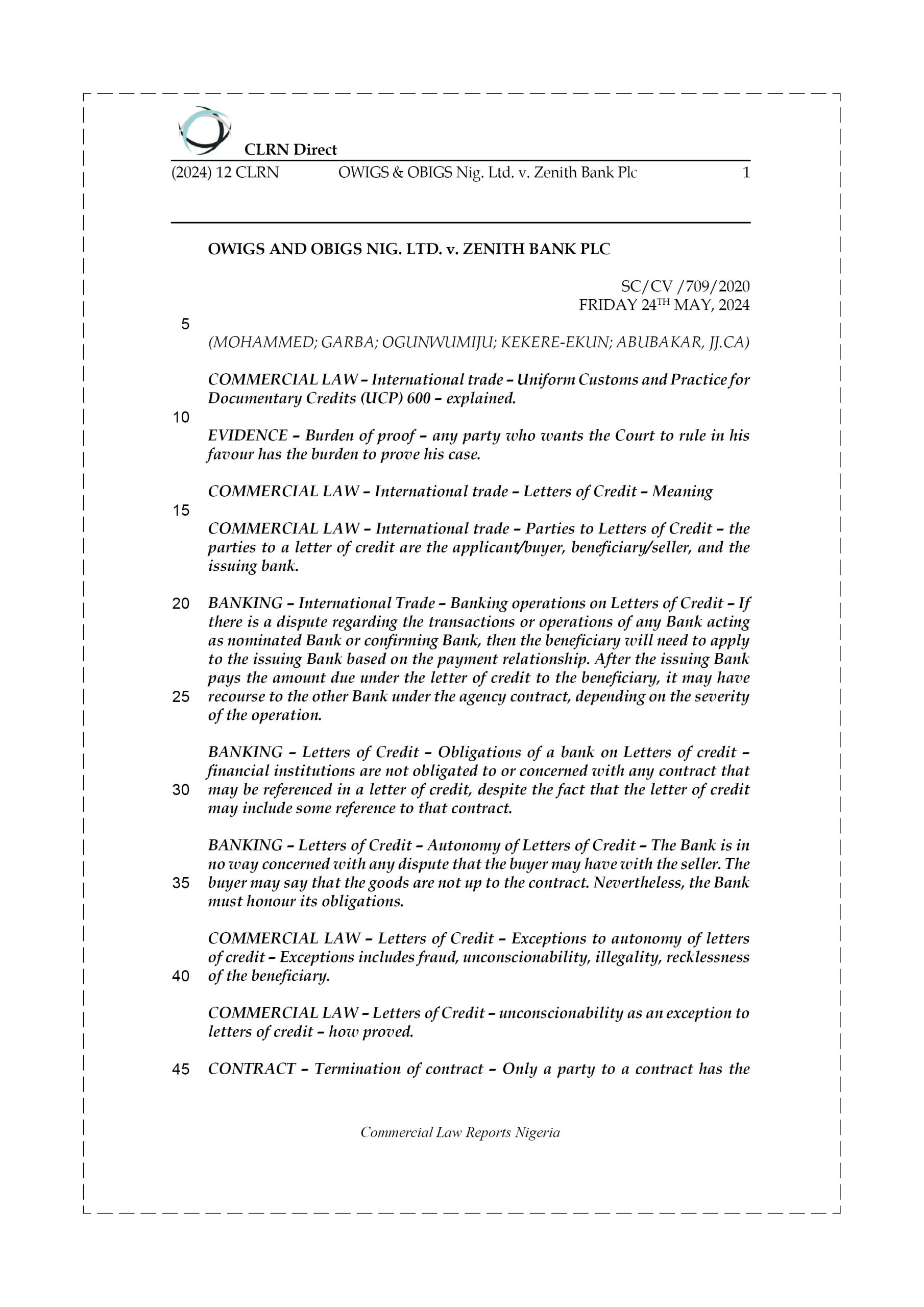 The Appellant entered into a banking relationship with the Respondent wherein the Respondent undertook to off er the Appellant Export Finance Facilities if the Appellant secures an Export Trade contract which must be backed by an acceptable and confirmed letters of credit from a foreign entity/company. Consequently, relying on the aforementioned agreement, the Appellant engaged the services of Eglone Group Asia Pte Ltd to broker foreign contracts for the supply of solid minerals wherein it was agreed that Eglone Group Asia Pte Ltd would be paid 4 (sic) commission by the Appellant as brokerage fees for each contract secured for the Appellant and in the event of a default in performance, the Plaintiff would pay 2% of the value of each contract as default fees. Following this Agreement, Eglone Group Asia Pte Ltd secured two foreign contracts with Chinese fi rms for the export of Tin Ore, Tantalite Ore and Columbite Ore from Nigeria to China by the Appellant. Thereafter, the Appellant caused Eglone Group Asia Pte Ltd to obtain draft copies of Letters of Credit from the Chinese companies’ bankers-Industrial and Commerce Bank of China (ICBC) and presented same to the Respondent for confirmation/amendment if any. However, the Respondent refused to confirm the letter of credit, despite having earlier negotiated and agreed on the details with ICBC before it was issued. Consequently, the contract between the Appellant and the Chinese companies were cancelled. Sequel to the cancellation of the contract, the Appellant became liable to pay penalty fee to Eglone Group Asia Pte Ltd for the breach occasioned by the Respondent.