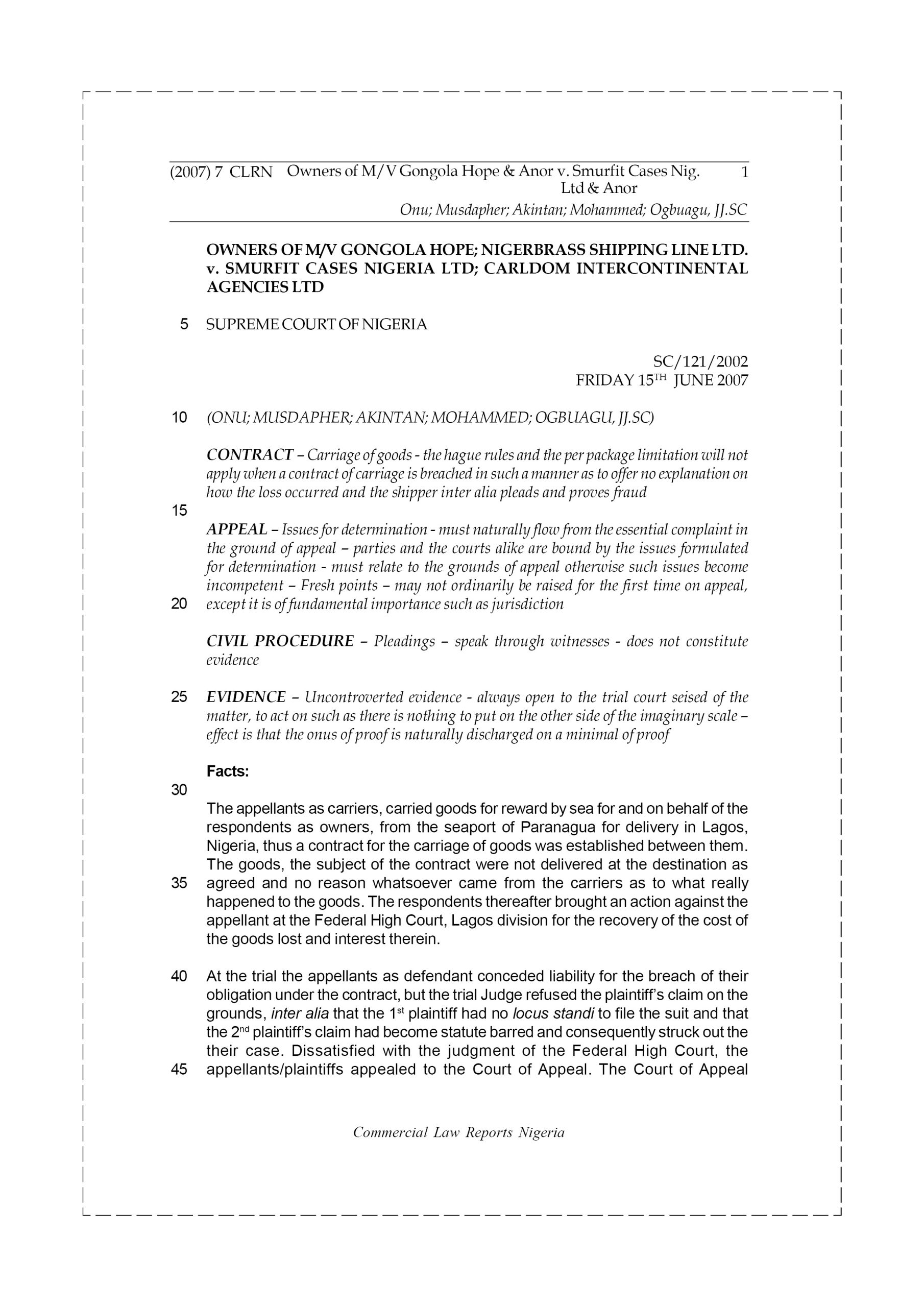 The appellants as carriers, carried goods for reward by sea for and on behalf of the respondents as owners, from the seaport of Paranagua for delivery in Lagos, Nigeria, thus a contract for the carriage of goods was established between them. The goods, the subject of the contract were not delivered at the destination as agreed and no reason whatsoever came from the carriers as to what really happened to the goods. The respondents thereafter brought an action against the appellant at the Federal High Court, Lagos division for the recovery of the cost of the goods lost and interest therein