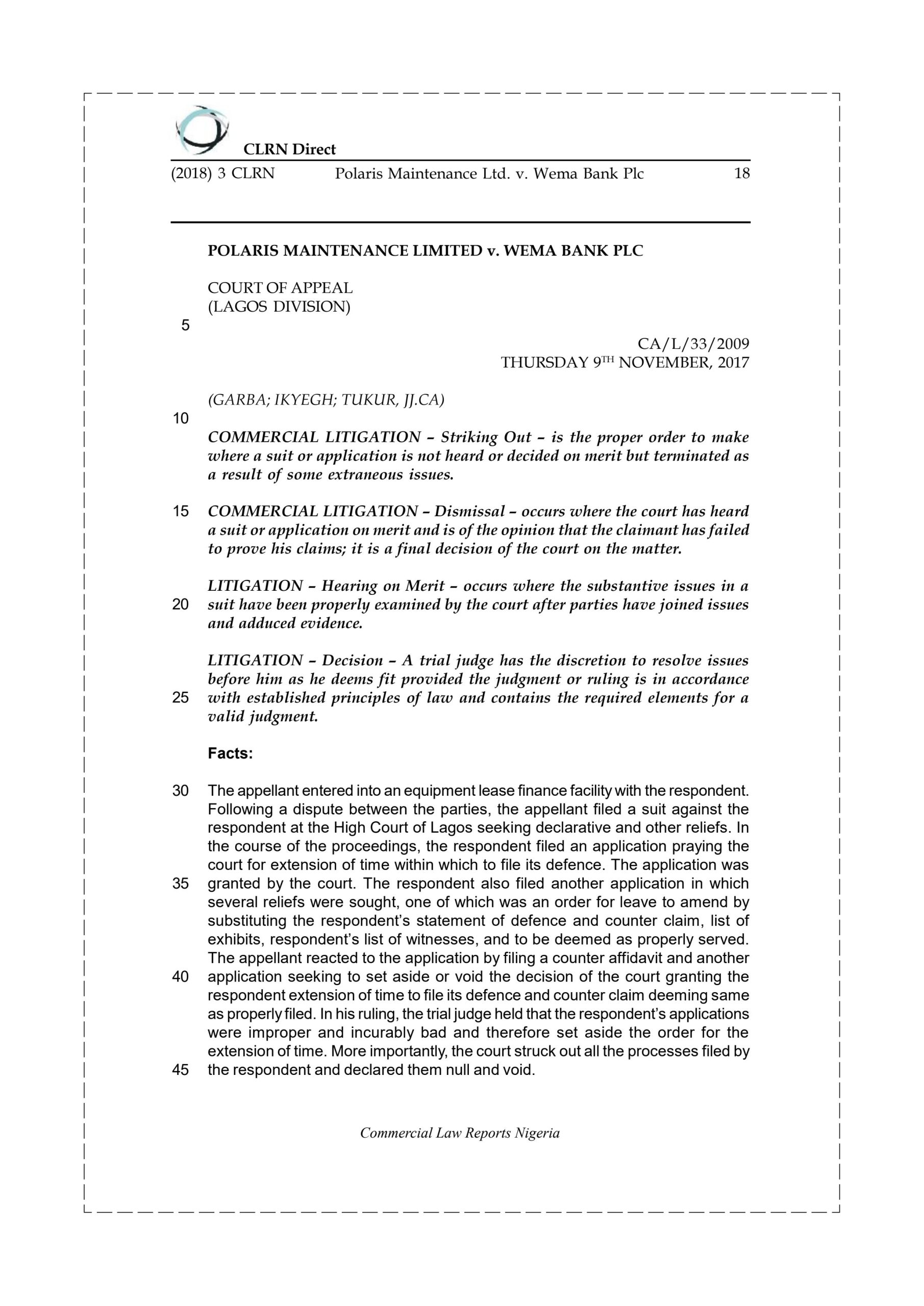 Court of Appeal, Lagos Division. The sole issue adopted by the court as being