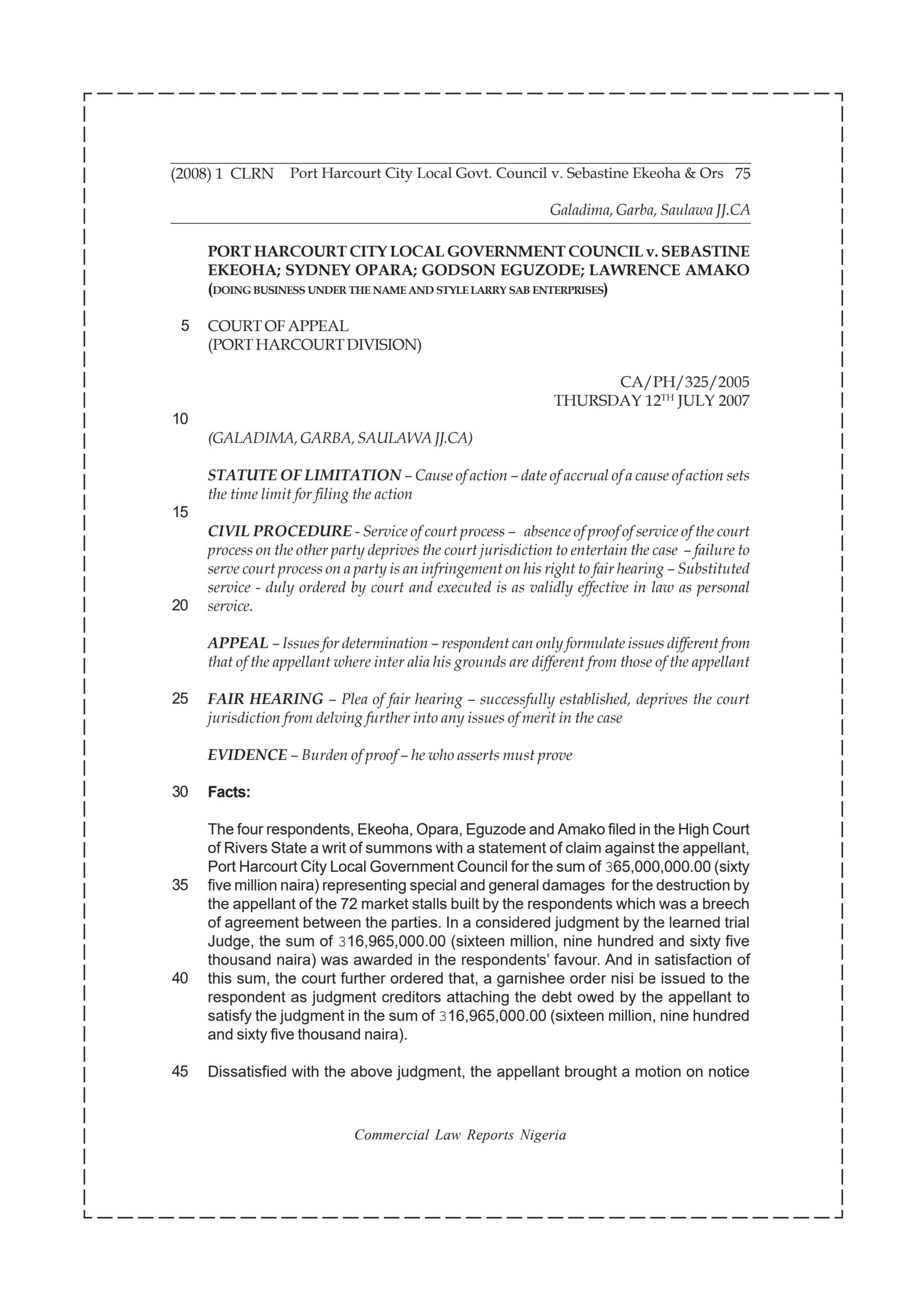 The four respondents, Ekeoha, Opara, Eguzode and Amako filed in the High Court of Rivers State a writ of summons with a statement of claim against the appellant, Port Harcourt City Local Government Council for the sum of N65,000,000.00 (sixty five million naira) representing special and general damages for the destruction by the appellant of the 72 market stalls built by the respondents which was a breech of agreement between the parties.