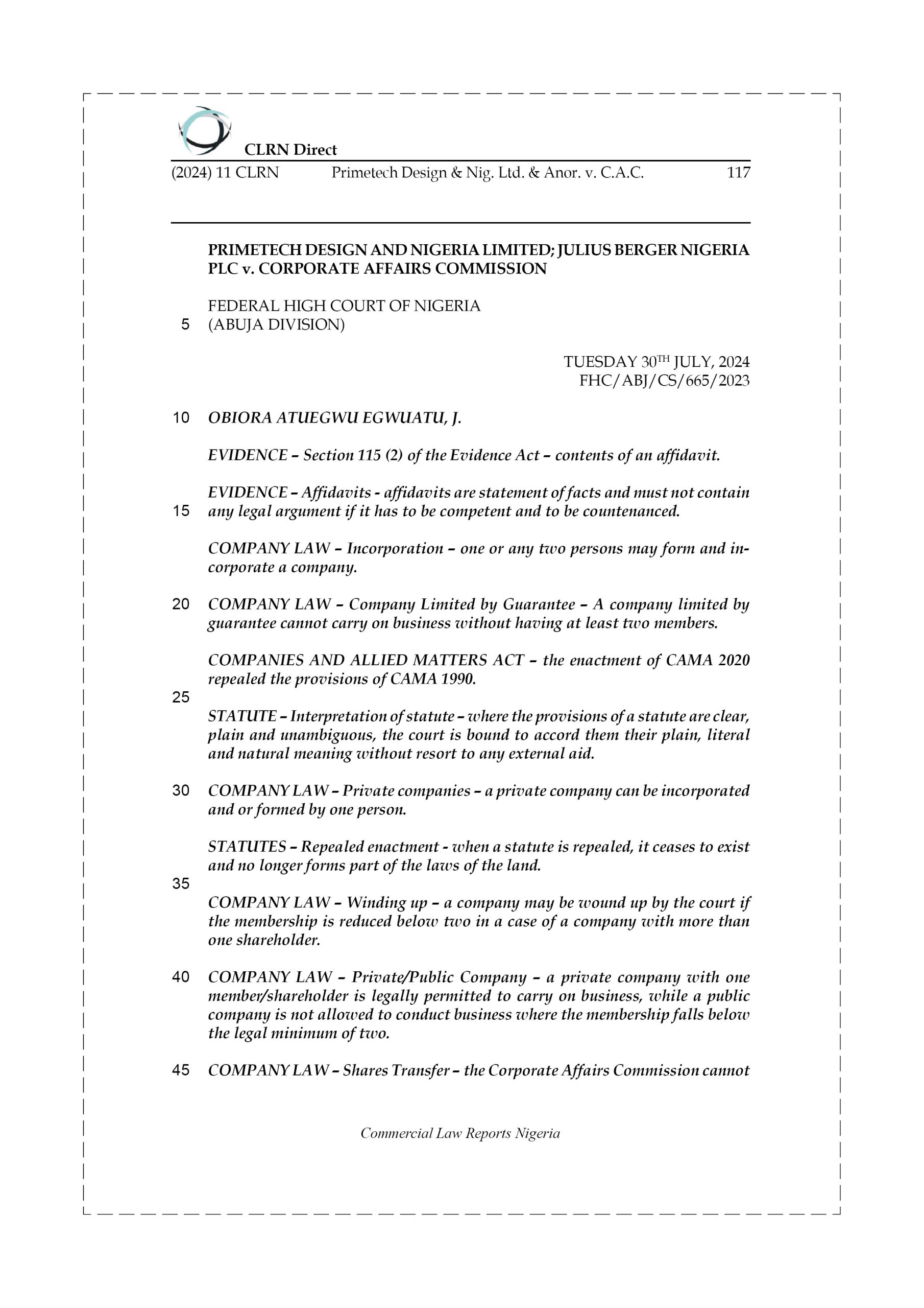 Primetech Designs and Nigeria Limited (1st Plaintiff’s) is a private company registered in Nigeria under the old CAMA and having two shareholders, Martin Brack and Julius Berger Nigeria PLC, the (2nd Plaintiff). By a share transfer instrument, dated April 25, 2022, Marthin Brack transferred all of his shares in the 1st Plaintiff to the 2nd Plaintiff. Thus, the 2nd Plaintiff became the only member/shareholder of the 1st Plaintiff. Following the transfer of shares from Martin Brack to the 2nd Plaintiff, the 1st Plaintiff notified the Corporate Affairs Commission (the Defendant) of the change in shareholding for the Defendant to update its Company Registration Portal (“CRP”) to reflect the share transfer and the fact that the 2nd Plaintiff was now the sole shareholder of the 1st Plaintiff . The Defendant, however, did not respond to the 1st Plaintiff. The 1st Plaintiff instructed its Solicitors, the fi rm of Messrs Ekhato & Co to formally request the Defendant to acknowledge the share