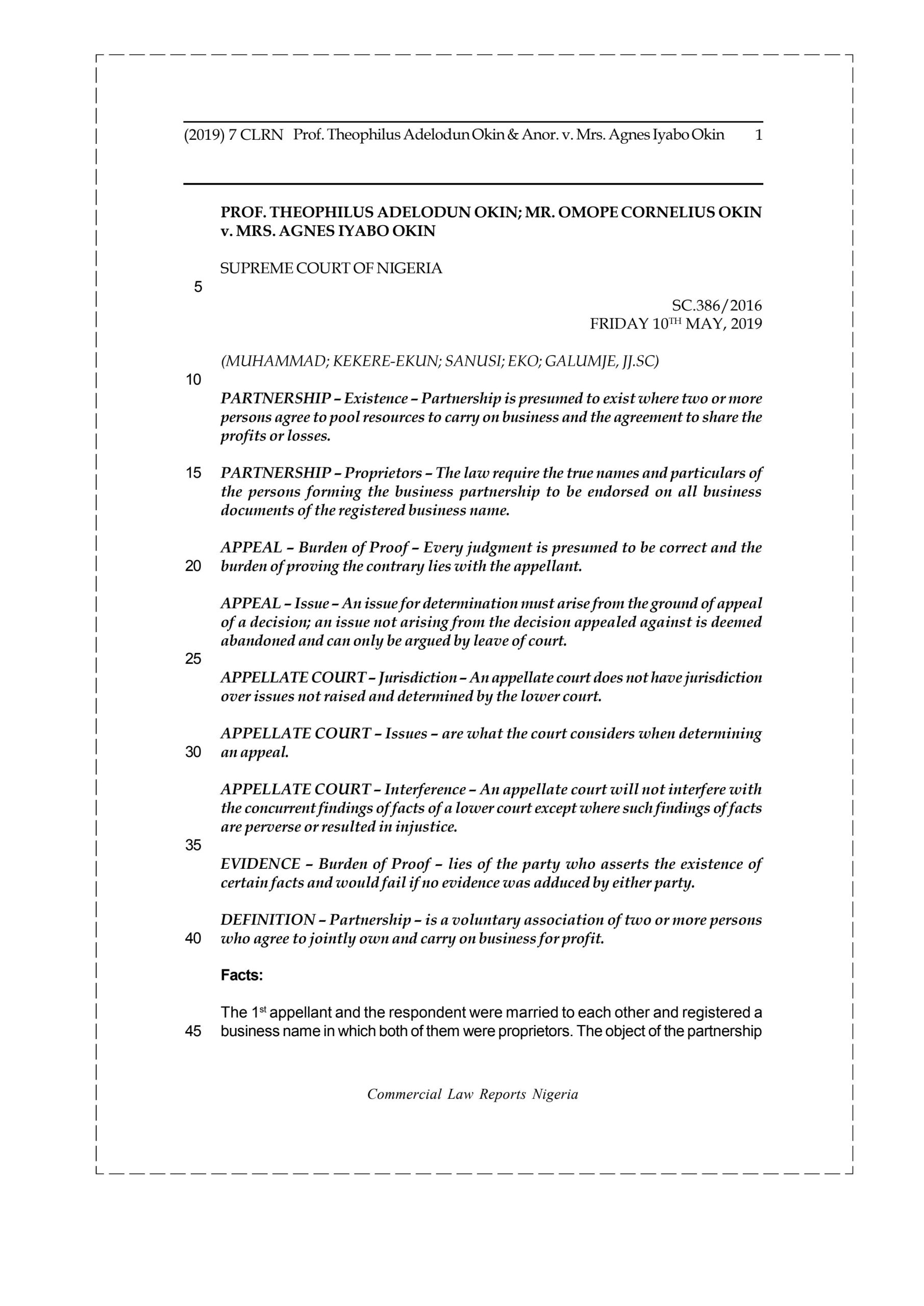 The matter went to trial and at the end of proceedings, the court gave judgment in favour of the respondent granting all the reliefs sought save an order to restrain the appellants from further running and administration of the schools. The appellants were dissatisfied with the decision and consequently filed a notice of appeal at the Court of Appeal, Ilorin Division. After hearing the parties on the appeal, the Court of Appeal dismissed it and held that the trial court was right in granting the reliefs sought by the respondent. Further dissatisfied, the appellants filed a notice of appeal at the Supreme Court asking it overrule the trial court and the Court of Appeal. One of the issues for determination is whether the existence of partnership could be inferred between the 1st appellant and the respondent in line with the requirements laid down by law.