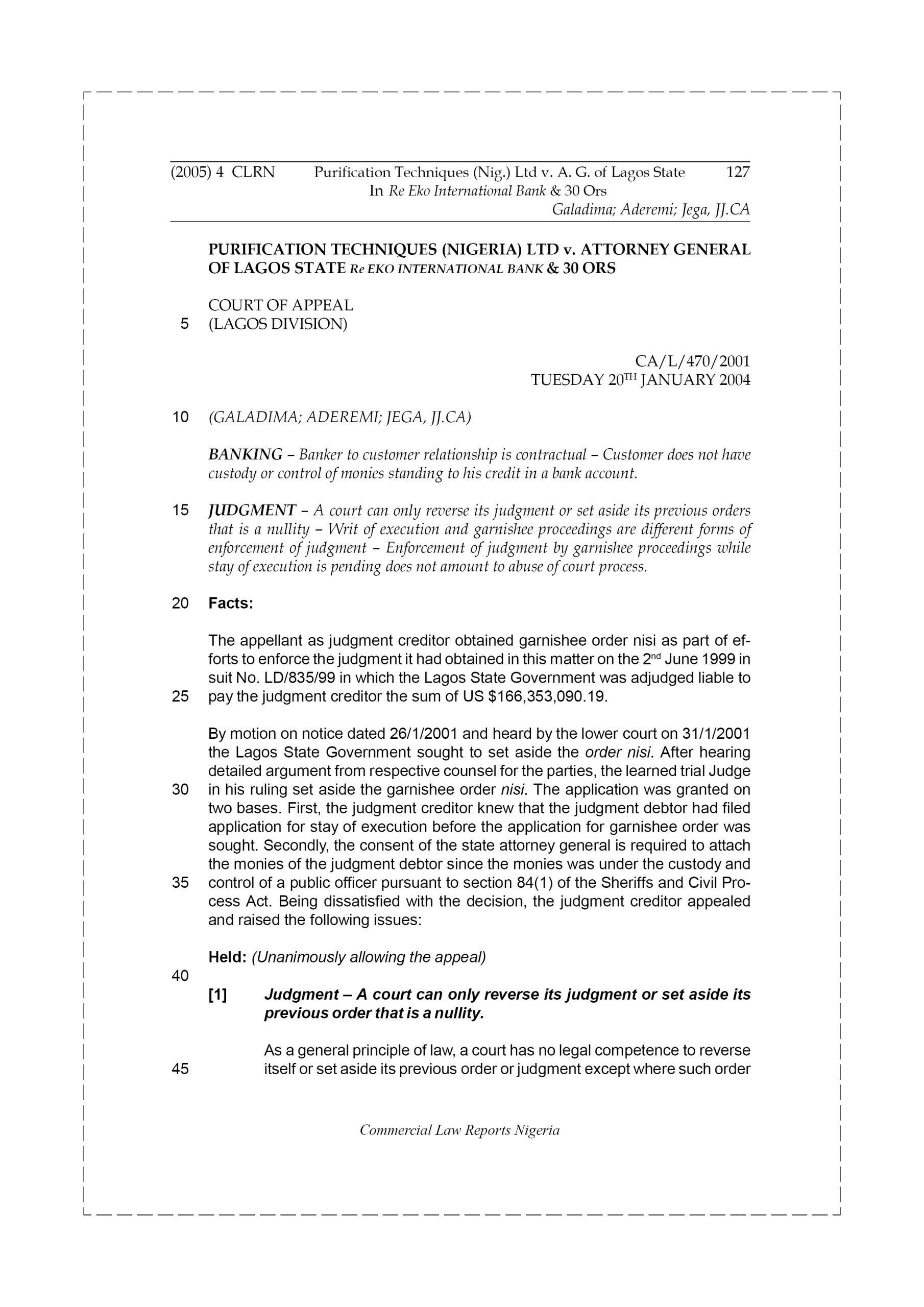 The appellant as judgment creditor obtained garnishee order nisi as part of efforts to enforce the judgment it had obtained in this matter on the 2nd June 1999 in suit No. LD/835/99 in which the Lagos State Government was adjudged liable to pay the judgment creditor the sum of US $166,353,090.19.