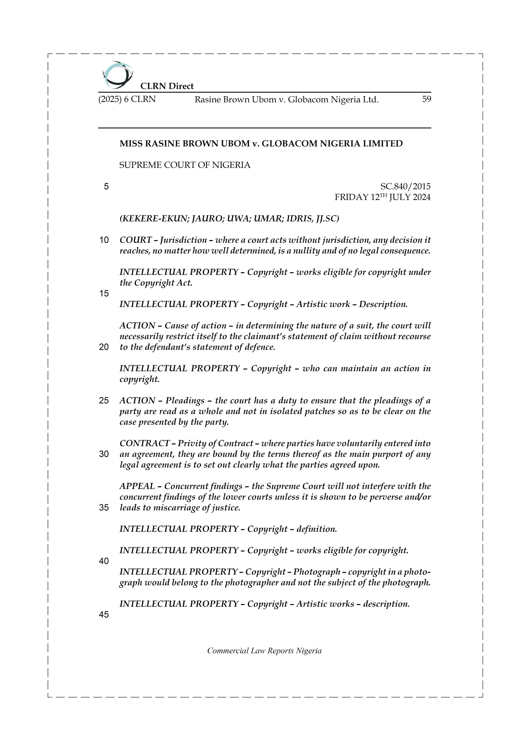 Dissatisfied with the decision of the trial court the Appellant appealed to the Court of Appeal. After a consideration of the briefs filed by the parties, the Court of Appeal in its judgment held that in the absence of clear pleadings of an agreement between the Appellant and the Respondent that constituted a contract in law upon which her claims could be premised, the High Court was right when it held that the Appellant’s claims in this case would appear to and could be within the purview of the provisions of the Copyright Act for the infringement of her right either as a singer or performer, or both, who participated in the singing/performing of a competition organized by the Respondent. Still dissatisfied with the judgment of the court below, the Appellant appealed to the Supreme Court. One of the issues raised for determination was Whether the Copyright Act.