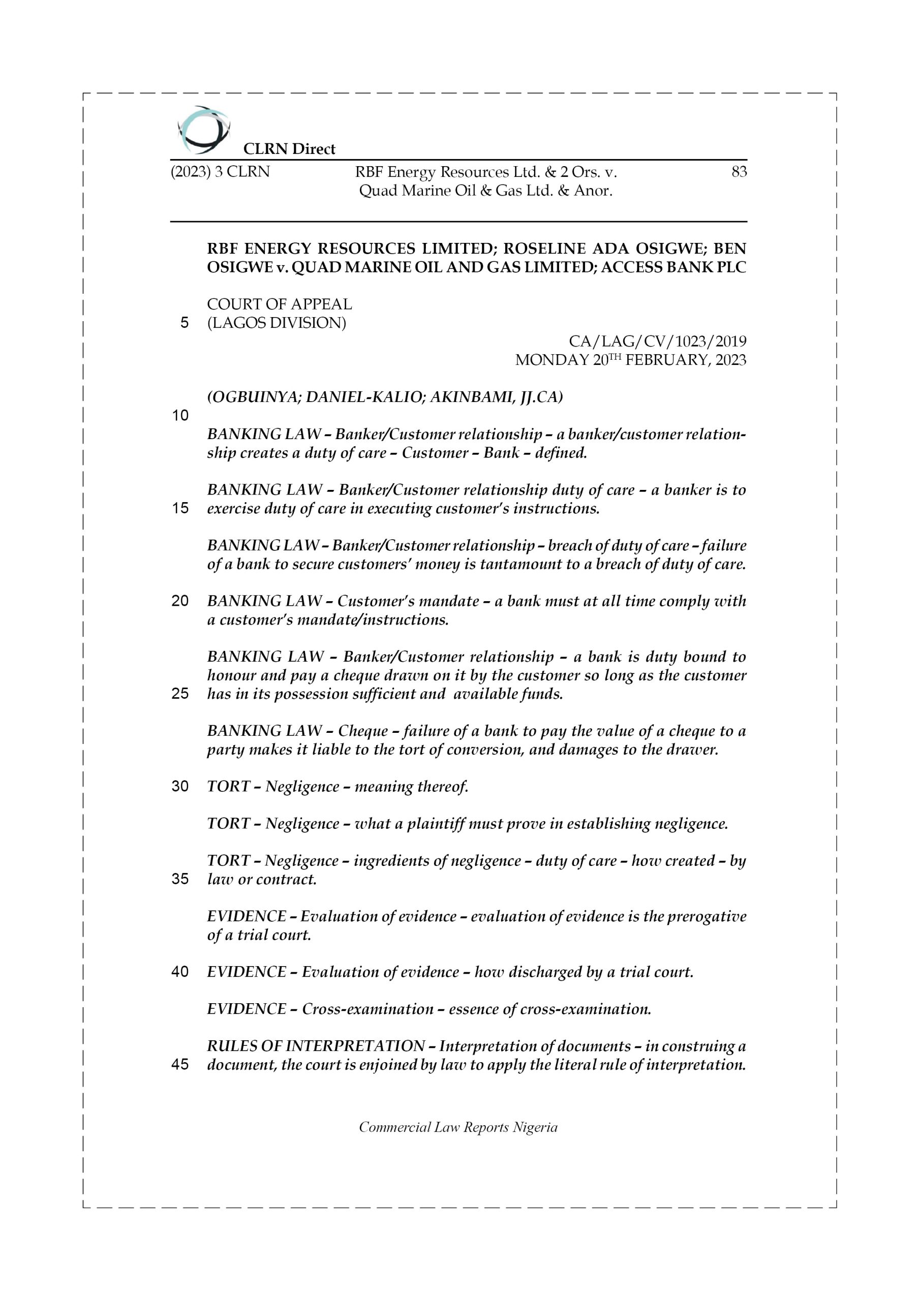 The cross-appellant, a dealer in petroleum products especially in the downstream sector of oil and gas industry, was a high-profile customer of Intercontinental Bank Plc which metamorphosed into fourth cross-respondent. In 2007, the fourth cross-respondent granted an initial facility of ₦40M, which it later increased to ₦80M, ₦250M and ₦350M, to the cross-appellant on certain securities. In 2006, at the behest of the second cross-respondent, the cross-appellant made her a commission agent on the sale of its petroleum products. In 2008, the cross-appellant entered into a contract of the supply of petroleum products to the first cross-respondent through the persuasion of the second and third cross-respondents who were the managing director and chairman/major promoter of the first cross-respondent respectively. The proceeds of the sales were to be remitted to the cross-appellant via its account with the fourth cross-respondent wherein the third cross-respondent doubled as a staff thereof. The cross-appellant alleged that between May and July, 2008, it supplied the first cross-respondent with petroleum products to the tune of ₦198M which the first – third cross-respondents, in collaboration with the officials of the fourth cross-respondent, converted to their own use. The cross-appellant further alleged that the fourth cross-respondent negligently allowed the first – third cross-respondents to make massive unauthorised withdrawals from its account with it. It further alleged that the fourth cross-respondent was careless, reckless and observed unprofessional conduct in dealing with its account. In reaction, the first – third cross-respondents and the fourth cross-respondent, upon serve of the processes on them, joined issue with the cross-appellant and denied liability by filing their statements of defence. In their defences, they described the action as a gold-digging, vexatious and frivolous matter. Upon conclusion of trial at the lower court, and in a considered judgment, the lower court granted some of the prayers in the cross-appellant’s suit.