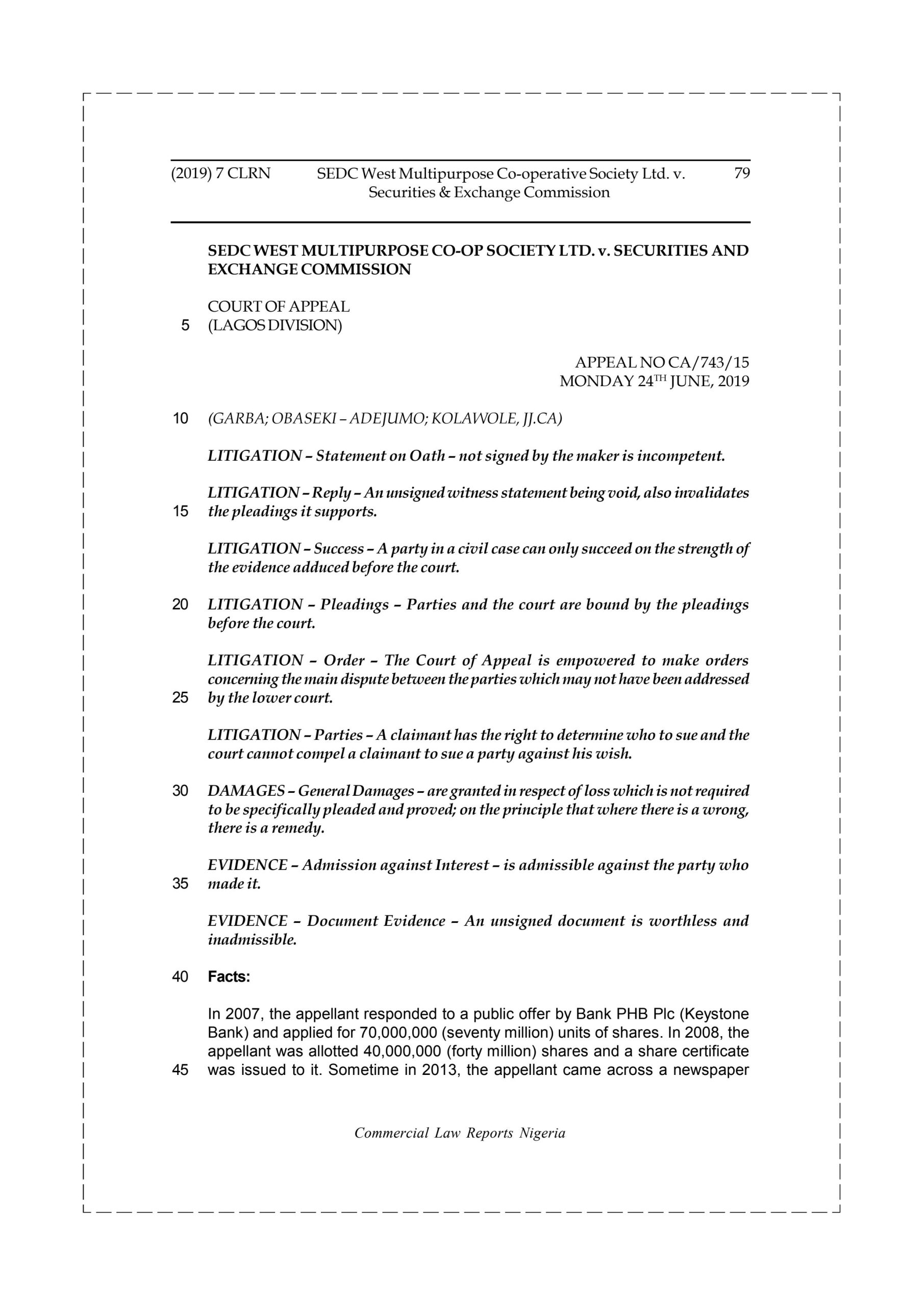 Consequently, the appellant filed a claim for the refund of N1,118,481,000,00 (One Billion, One Hundred and Eighteen Million, Four Hundred and Eighty One Thousand Naira) and damages against the respondent at the Investments and Securities Tribunal. Parties filed their pleadings. At issue at the tribunal was the statement on oath of the witness for the respondent which was not signed. Even though the tribunal held that the respondent was in breach of its duty of care to the appellant, it however relied on the unsigned statement on oath to deny the appellant the reliefs sought. Dissatisfied with the decision of the tribunal, the appellant filed a notice of appeal at the Court of Appeal, Lagos Division urging the court to reverse the decision of the tribunal. One of the issues for determination is whether the unsigned statement on oath of the witness of the respondent was invalid and should have been disregarded, expunged and struck out by the tribunal in determining the suit.