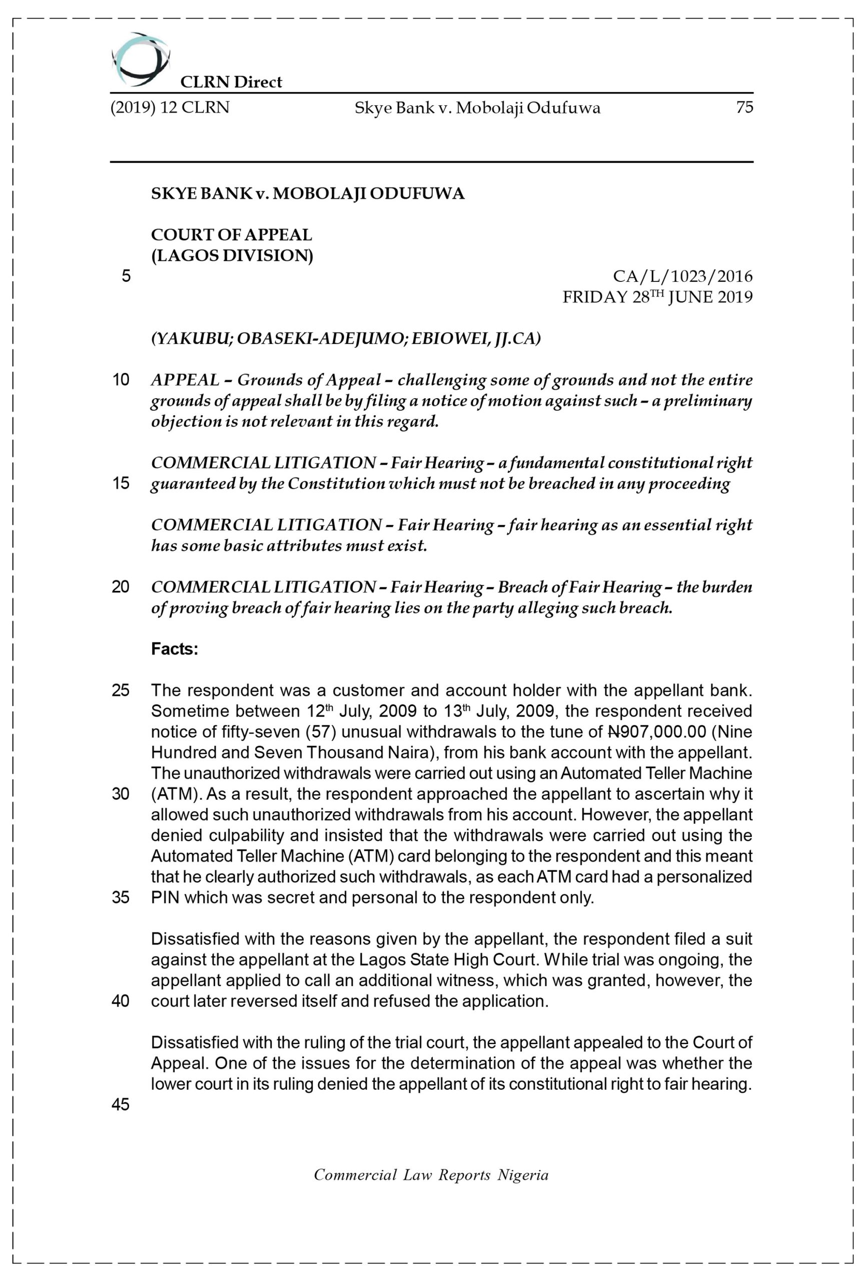 However, the appellant denied culpability and insisted that the withdrawals were carried out using the Automated Teller Machine (ATM) card belonging to the respondent and this meant that he clearly authorized such withdrawals, as each ATM card had a personalized PIN which was secret and personal to the respondent only. Dissatisfied with the reasons given by the appellant, the respondent filed a suit against the appellant at the Lagos State High Court. While trial was ongoing, the appellant applied to call an additional witness, which was granted, however, the court later reversed itself and refused the application. Dissatisfied with the ruling of the trial court, the appellant appealed to the Court of Appeal.