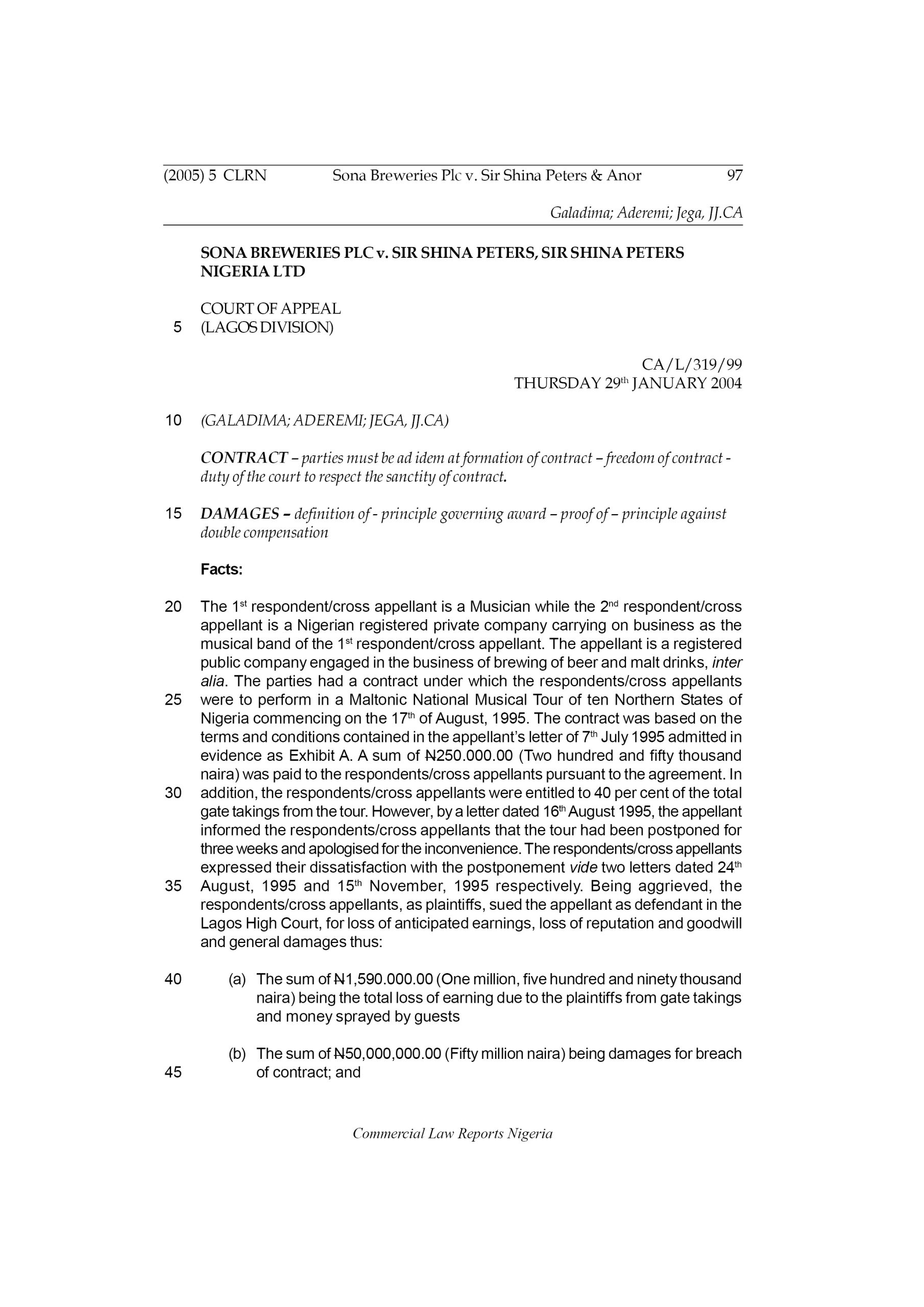 The 1st respondent/cross appellant is a Musician while the 2nd respondent/cross appellant is a Nigerian registered private company carrying on business as the musical band of the 1st respondent/cross appellant. The appellant is a registered public company engaged in the business of brewing of beer and malt drinks, inter alia. The parties had a contract under which the respondents/cross appellants were to perform in a Maltonic National Musical Tour of ten Northern States of Nigeria commencing on the 17th of August, 1995. The contract was based on the terms and conditions contained in the appellant’s letter of 7th July 1995 admitted in evidence as Exhibit A. A sum of N250.000.00 (Two hundred and fifty thousand naira) was paid to the respondents/cross appellants pursuant to the agreement. In addition, the respondents/cross appellants were entitled to 40% per cent of the total gate takings from the tour. However, by a letter dated 16th August 1995, the appellant informed the respondents/cross appellants that the tour had been postponed for three weeks and apologised for the inconvenience. The respondents/cross appellants expressed their dissatisfaction with the postponement vide two letters dated 24th August, 1995 and 15th November, 1995 respectively. Being aggrieved, the respondents/cross appellants, as plaintiffs, sued the appellant as defendant in the Lagos High Court, for loss of anticipated earnings, loss of reputation and goodwill and general damages thus:
