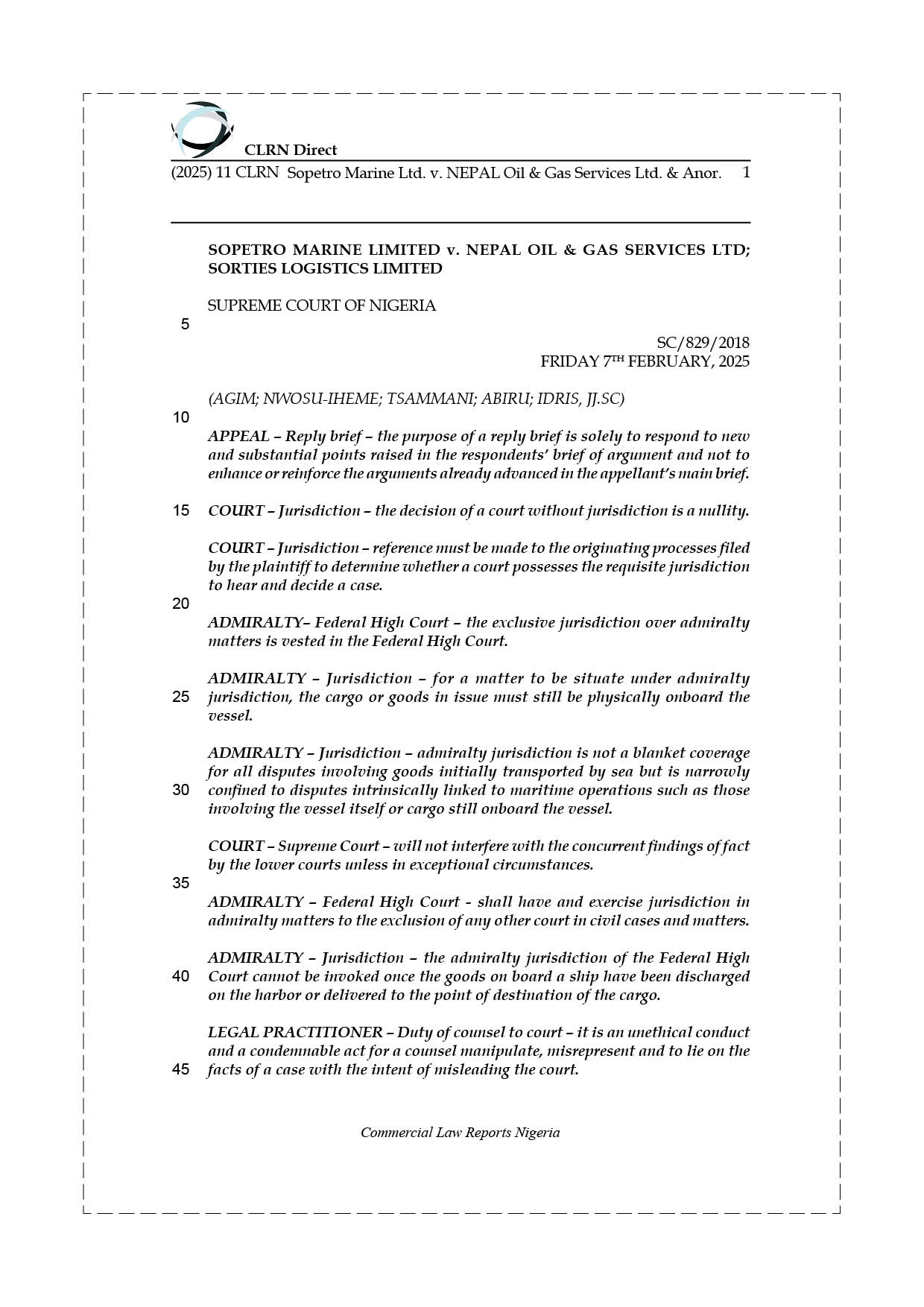 Similarly, sometime in September 2013, the Claimants engaged the Defendant to transport 5,000 metric tonnes of Dual Purpose Kerosene (DPK) using one of the vessels under the Defendant’s management, S.P. Brussels, on a 20-day time charter at the rate of USD 10,000 per day. The Claimants paid USD 200,000 into the Defendant’s account as the freight sum to be transferred to the vessel owner. However, the Defendant allegedly diverted the funds to other ventures, prompting the Claimants to make a fresh payment of USD 200,000 directly to the vessel owners to complete the transaction. The Defendant thereafter failed or refused to refund the initial payment of USD 200,000. Furthermore, the Claimants averred that in April 2013, they utilized the Defendant’s services to transport another 5,000 metric tonnes of DPK for ₦15,000,000.00. It was later discovered that only 2,500 metric tonnes belonged to the Claimants, while the remaining 2,500 metric tonnes belonged to another client of the Defendant. The Claimants demanded a refund of ₦7,500,000.00, being the overcharge, but the Defendant failed to make the repayment. The Claimants maintained that the funds advanced to the Defendant formed part of their operational capital obtained from commercial banks, on which interest continued to accrue. Despite repeated demands, both oral and written, the Defendant failed to refund the sums due.