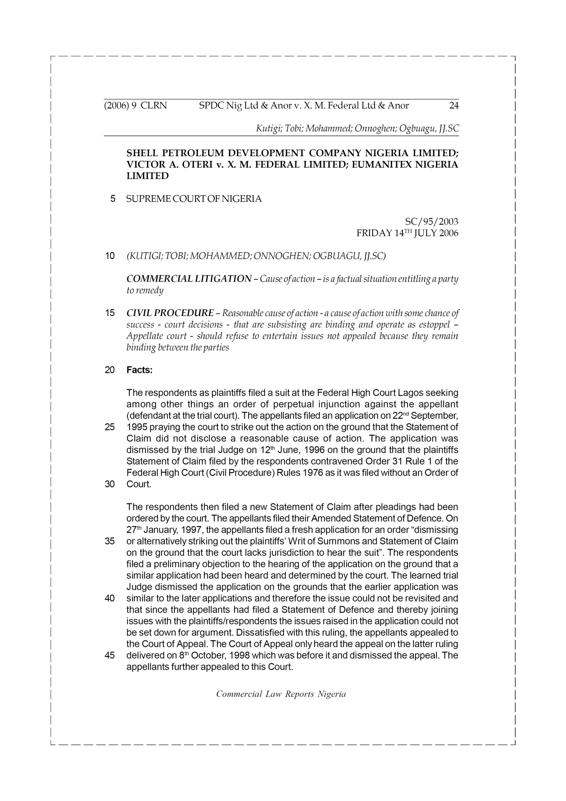 The respondents as plaintiffs filed a suit at the Federal High Court Lagos seeking among other things an order of perpetual injunction against the appellant (defendant at the trial court). The appellants filed an application on 22nd September, 1995 praying the court to strike out the action on the ground that the Statement of Claim did not disclose a reasonable cause of action. The application was dismissed by the trial Judge on 12th June, 1996 on the ground that the plaintiffs Statement of Claim filed by the respondents contravened Order 31 Rule 1 of the Federal High Court (Civil Procedure) Rules 1976 as it was filed without an Order of Court.