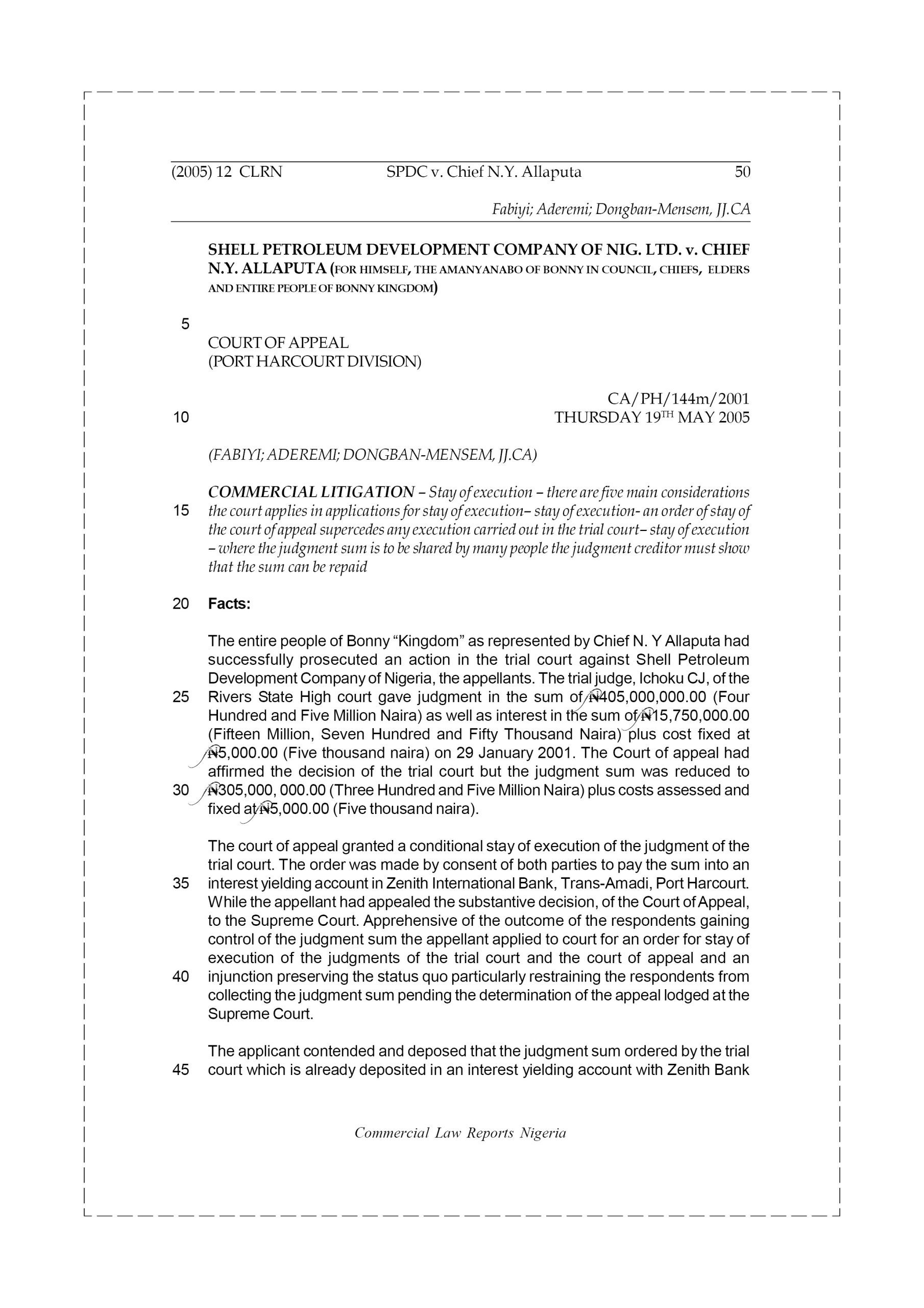 The entire people of Bonny “Kingdom” as represented by Chief N. Y Allaputa had successfully prosecuted an action in the trial court against Shell Petroleum Development Company of Nigeria, the appellants. The trial judge, Ichoku CJ, of the Rivers State High court gave judgment in the sum of N405,000,000.00 (Four Hundred and Five Million Naira) as well as interest in the sum of N15,750,000.00 (Fifteen Million, Seven Hundred and Fifty Thousand Naira) plus cost fixed at N5,000.00 (Five thousand naira) on 29 January 2001. The Court of appeal had affirmed the decision of the trial court but the judgment sum was reduced to N305,000, 000.00 (Three Hundred and Five Million Naira) plus costs assessed and fixed at N5,000.00 (Five thousand naira).