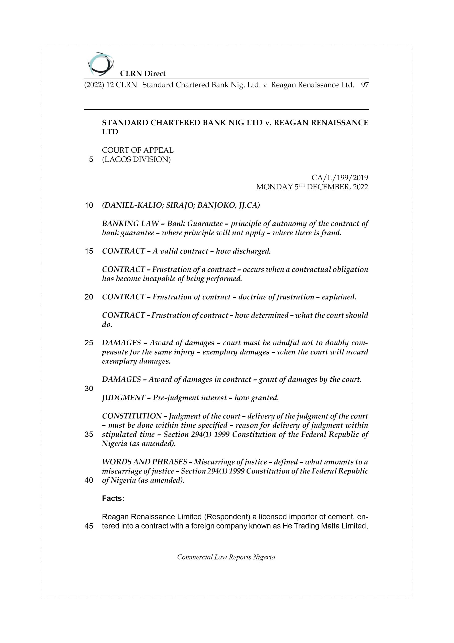 Reagan Renaissance Limited (Respondent) a licensed importer of cement, entered into a contract with a foreign company known as He Trading Malta Limited, for the supply of 300,000 metric tonnes of bagged ordinary Portland cement into Nigeria. The supply was to be made in September, October, or November 2009. Pursuant to that contract, the Respondent entered into an agreement with Standard Chartered Bank Nigeria Limited (Appellant), to issue a Bank Guarantee on its behalf, to HC Trading Malta Limited in the initial sum of, $1 million, which sum was later increased to $2.36 million, so as to cover the financial exposure of HC Trading Malta Limited and any attendant demurrage costs. As consideration for issuing the said Bank Guarantee, the Respondent provided an equal cash collateral in its fixed deposit account with the Appellant. HC Trading Malta Limited however defaulted in supplying the cement. Within the supply period of the cement by HC Trading Malta Limited, the Respondent was informed that the Federal Government of Nigeria had banned the importation of bagged cement into Nigeria. As a result of the ban, the Respondent instructed the Appellant to cancel the Bank Guarantee.