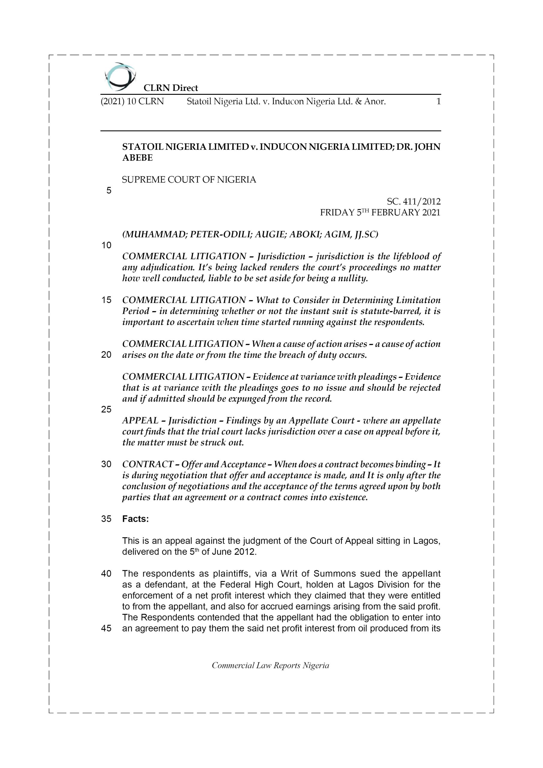 The respondents as plaintiffs, via a Writ of Summons sued the appellant as a defendant, at the Federal High Court, holden at Lagos Division for the enforcement of a net profit interest which they claimed that they were entitled to from the appellant, and also for accrued earnings arising from the said profit. The Respondents contended that the appellant had the obligation to enter into an agreement to pay them the said net profit interest from oil produced from its oil block, just as their counterpart had done, that the appellant had represented to them that it would enter in to such agreement with them and that it was this representation that made it provide its brokerage services to the benefit of the appellant and influenced the allocation of oil blocks by the Ministry of Petroleum to it.