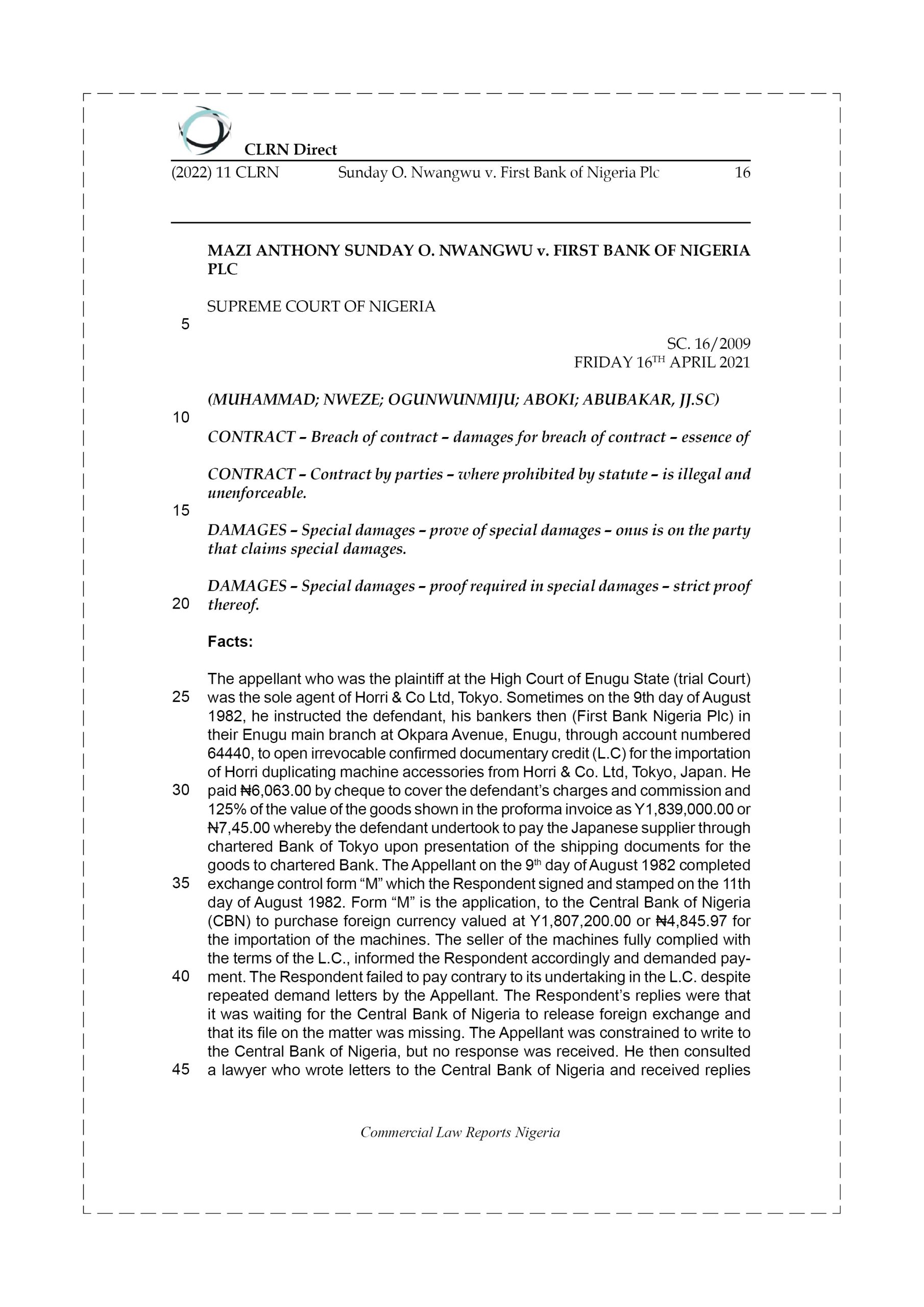 The Appellant on the 9th day of August 1982 completed exchange control form “M” which the Respondent signed and stamped on the 11th day of August 1982. Form “M” is the application, to the Central Bank of Nigeria (CBN) to purchase foreign currency valued at Y1,807,200.00 or ₦4,845.97 for the importation of the machines. The seller of the machines fully complied with the terms of the L.C., informed the Respondent accordingly and demanded payment. The Respondent failed to pay contrary to its undertaking in the L.C. despite repeated demand letters by the Appellant. The Respondent’s replies were that it was waiting for the Central Bank of Nigeria to release foreign exchange and that its file on the matter was missing. The Appellant was constrained to write to the Central Bank of Nigeria, but no response was received. He then consulted a lawyer who wrote letters to the Central Bank of Nigeria and received replies that the defendant informed him that the L.C. had been settled contrary to the Appellant’s letter.