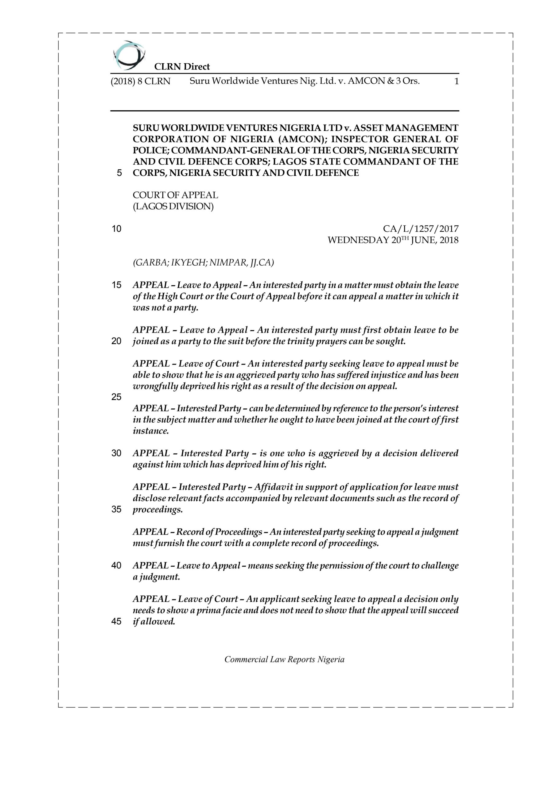 The 2nd to 4th respondents, in compliance with the ruling, deployed its officers and men to the properties in question and enforced the ruling of the court. The appellant was aggrieved and filed an application at the Court of Appeal, Lagos Division seeking among several reliefs, an order of the court for extension of time within which to apply for leave to appeal the ruling of the court as an interested party in the matter. The appellant also sought orders granting it leave to appeal the ruling as well as extension of time to file the notice and grounds of appeal against the ruling of the court. Several interlocutory orders were also sought wherein the appellant asked for suspension of the execution of the ruling of the court and to restrain the respondents from continuing to interfere with its peaceable possession of the properties.