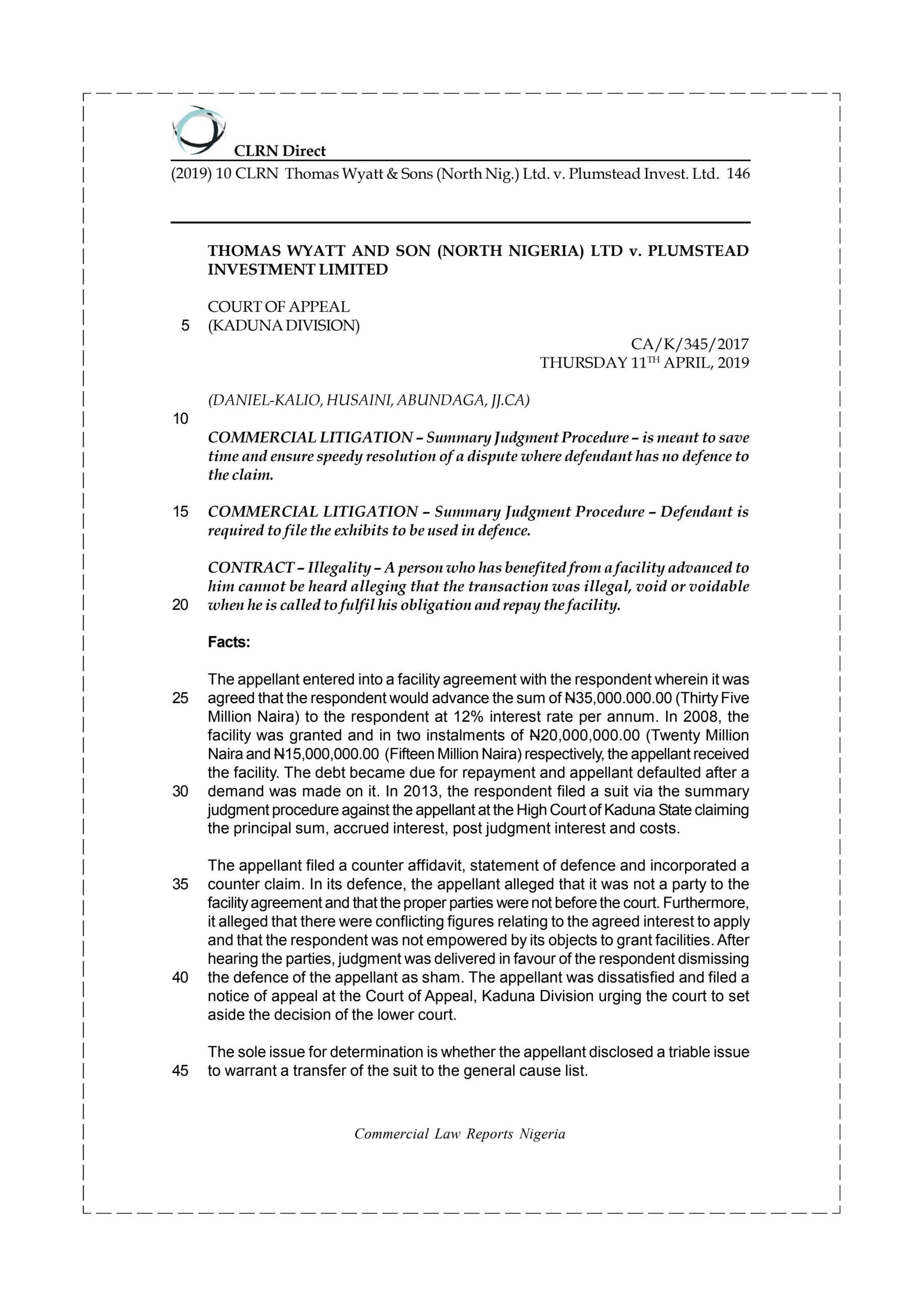 In 2013, the respondent filed a suit via the summary judgment procedure against the appellant at the High Court of Kaduna State claiming the principal sum, accrued interest, post judgment interest and costs. The appellant filed a counter affidavit, statement of defence and incorporated a counter claim. In its defence, the appellant alleged that it was not a party to the facility agreement and that the proper parties were not before the court. Furthermore, it alleged that there were conflicting figures relating to the agreed interest to apply and that the respondent was not empowered by its objects to grant facilities.