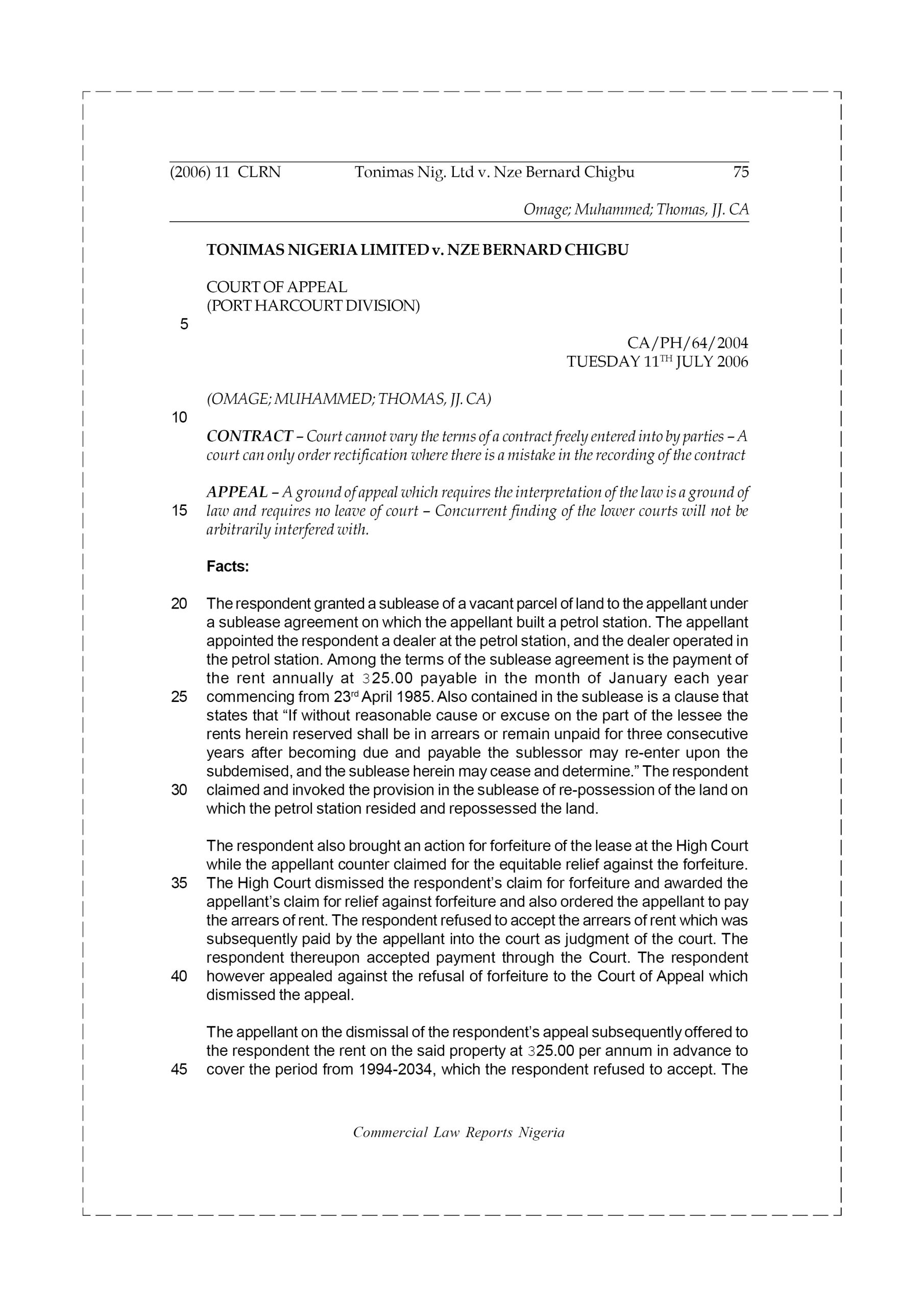 The respondent granted a sublease of a vacant parcel of land to the appellant under a sublease agreement on which the appellant built a petrol station. The appellant appointed the respondent a dealer at the petrol station, and the dealer operated in the petrol station. Among the terms of the sublease agreement is the payment of the rent annually at N25.00 payable in the month of January each year commencing from 23rd April 1985. Also contained in the sublease is a clause that states that “If without reasonable cause or excuse on the part of the lessee the rents herein reserved shall be in arrears or remain unpaid for three consecutive years after becoming due and payable the sublessor may re-enter upon the subdemised, and the sublease herein may cease and determine.” The respondent claimed and invoked the provision in the sublease of re-possession of the land on which the petrol station resided and repossessed the land.