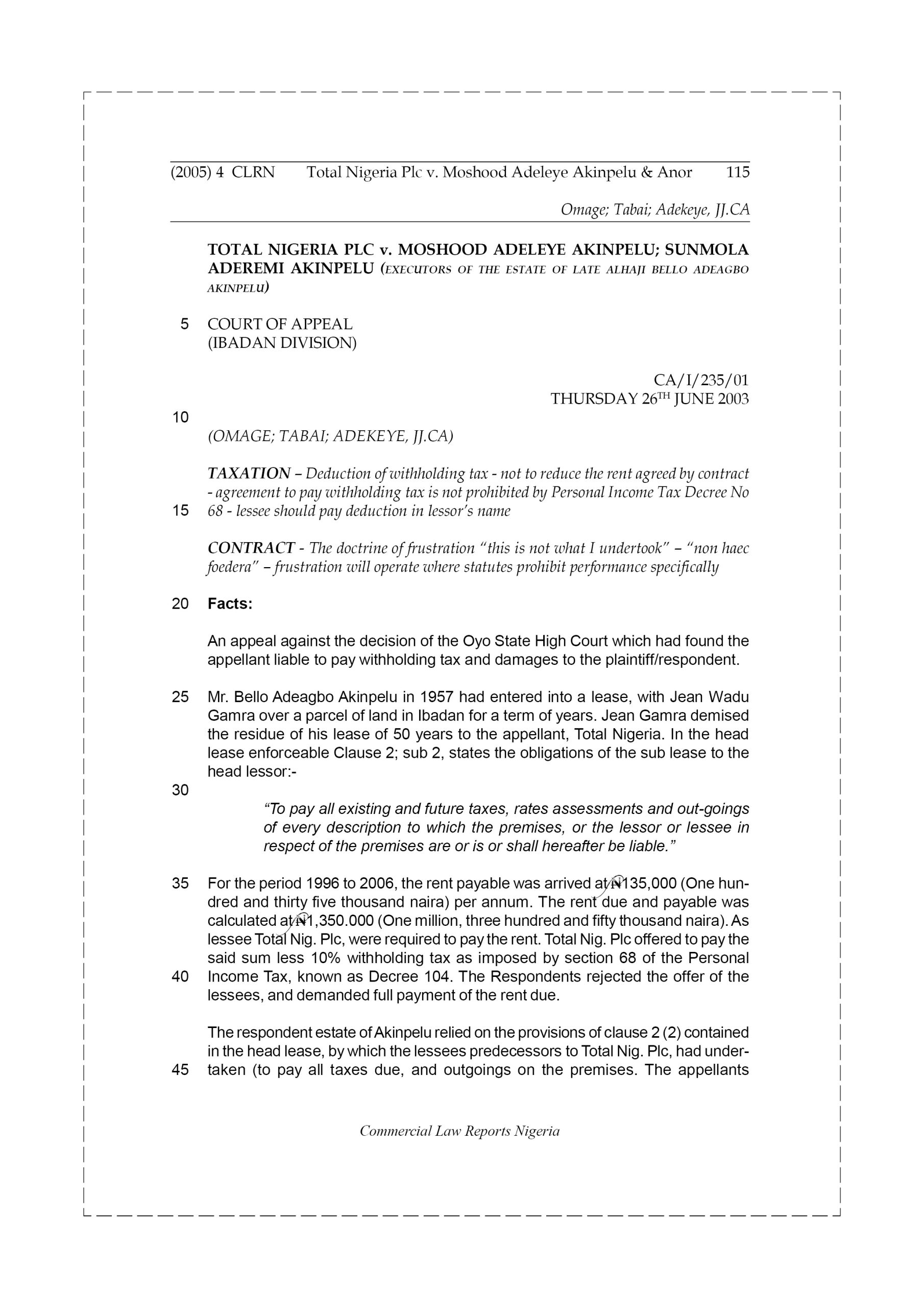 An appeal against the decision of the Oyo State High Court which had found the appellant liable to pay withholding tax and damages to the plaintiff/respondent.