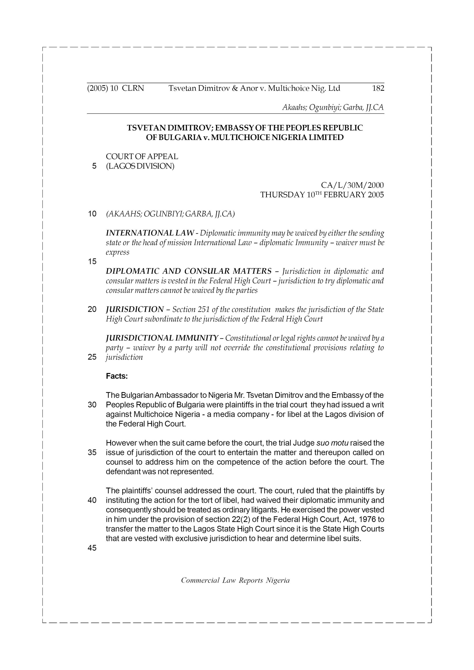 The Bulgarian Ambassador to Nigeria Mr. Tsvetan Dimitrov and the Embassy of the Peoples Republic of Bulgaria were plaintiffs in the trial court they had issued a writ
