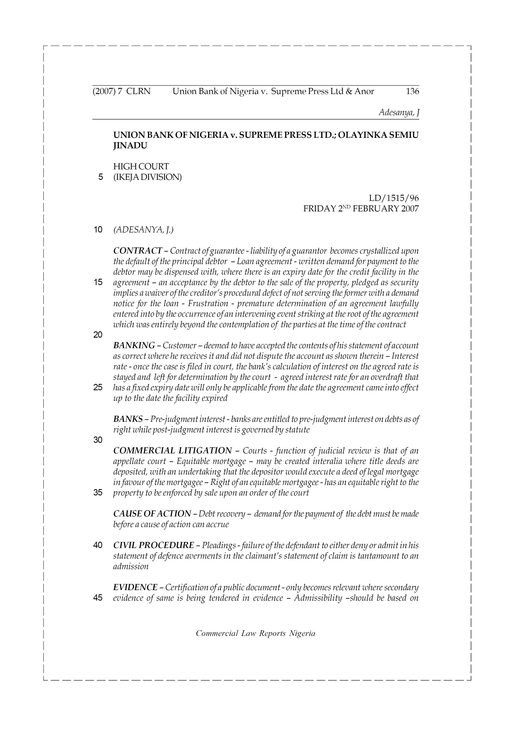 The claimant bank brought an action by a writ of summons against the defendants jointly and severally for the recovery of debt with interest, in form of a loan it had advanced to the defendants. The facts which led to the suit are that between 1991 and 1994, the claimant bank gave several loans and overdraft facilities to the 1st defendant to the tune of N27,867,015.00 (twenty seven million, eight hundred and sixty-seven thousand, fifteen naira) and the said facilities were secured by the personal continuing and unlimited guarantee of the original 2nd defendant (now deceased) who was the now 2nd defendant’s mother coupled with the deposit of the deeds on some of her properties with an undertaking to execute a legal mortgage, which was not executed.
