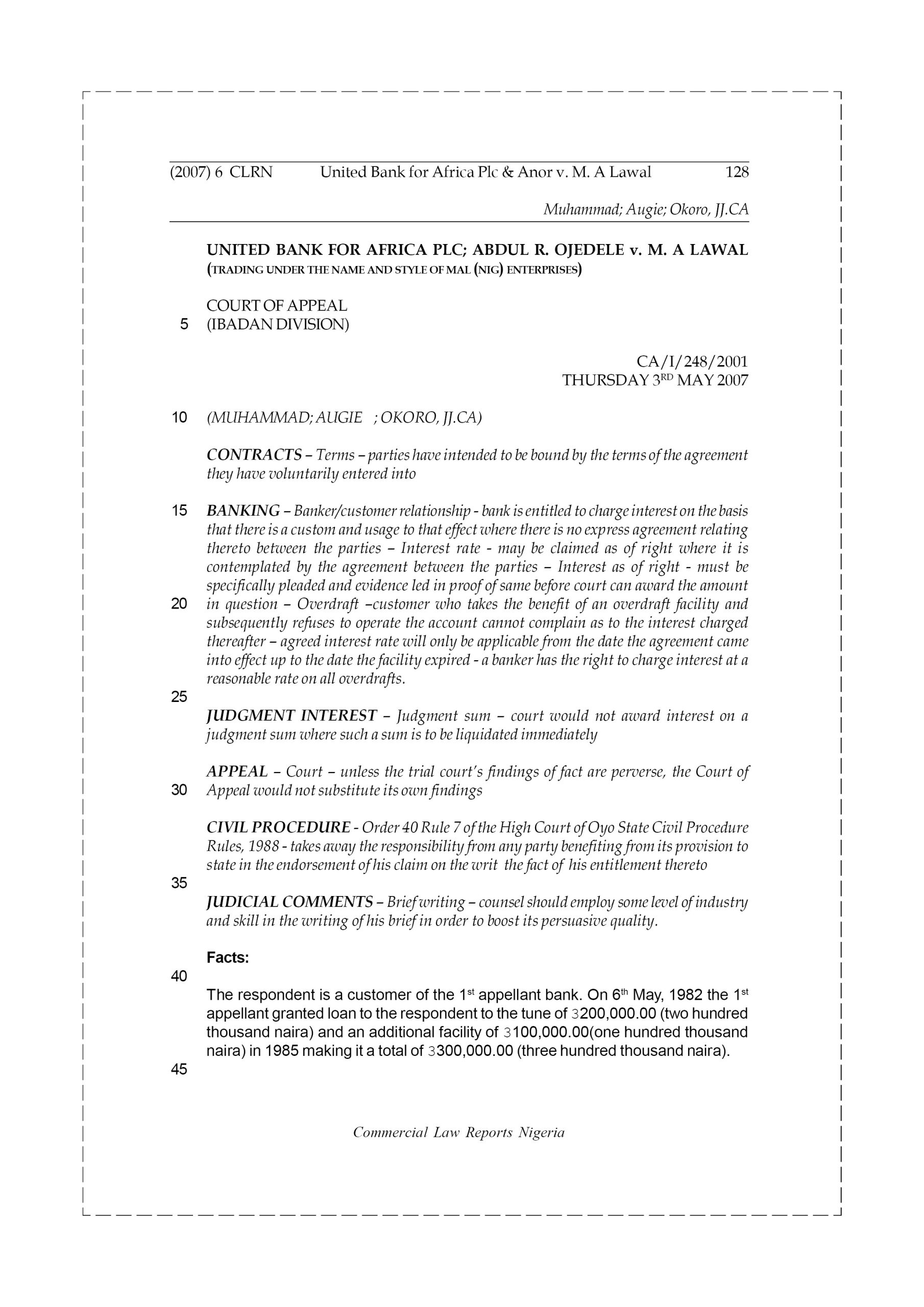 The respondent is a customer of the 1st appellant bank. On 6th May, 1982 the 1st appellant granted loan to the respondent to the tune of N200,000.00 (two hundred thousand naira) and an additional facility of N100,000.00(one hundred thousand naira) in 1985 making it a total of N300,000.00 (three hundred thousand naira).