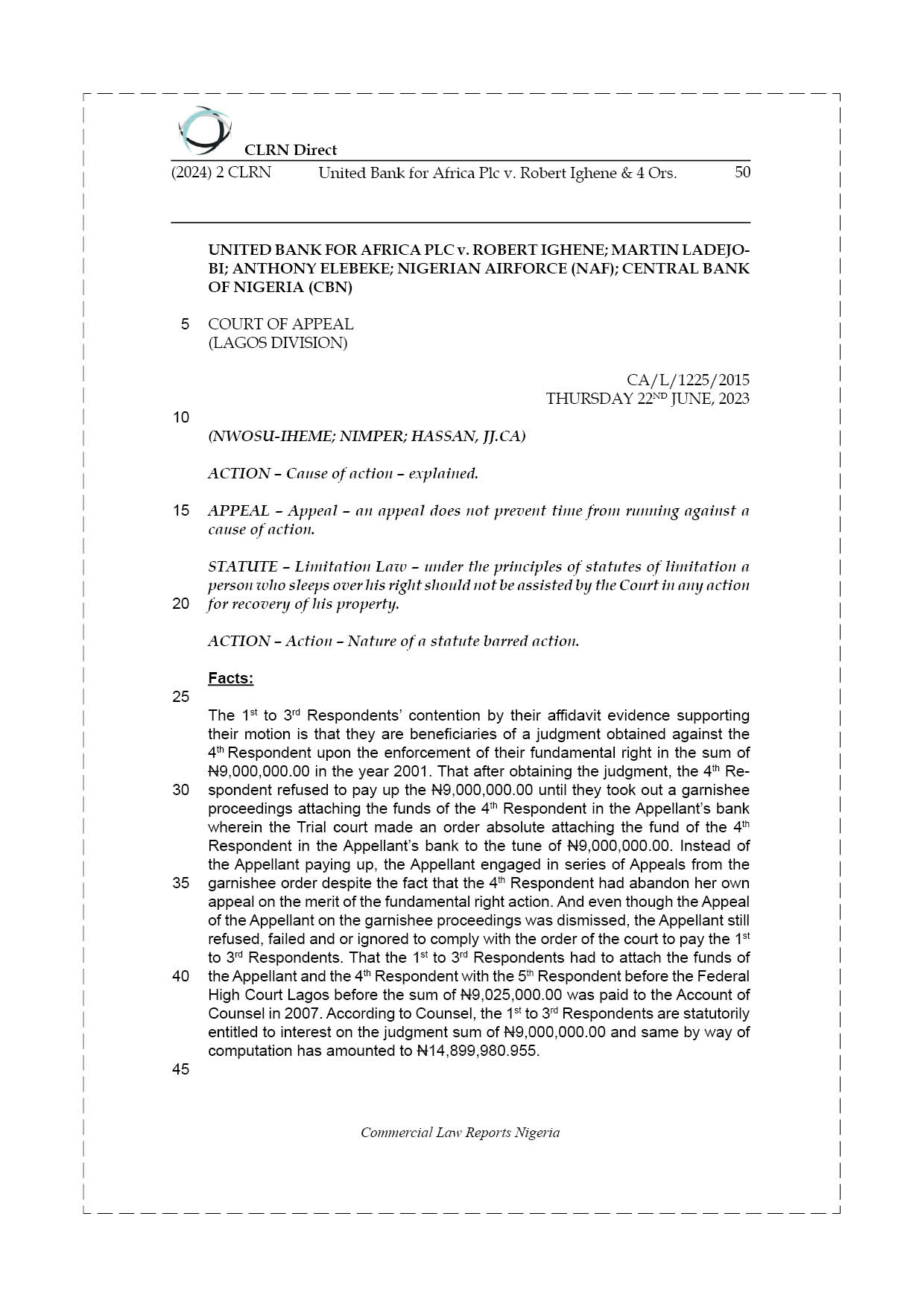 The 1st to 3rd Respondents’ contention by their affidavit evidence supporting their motion is that they are beneficiaries of a judgment obtained against the 4th Respondent upon the enforcement of their fundamental right in the sum of N9,000,000.00 in the year 2001. That after obtaining the judgment, the 4th Respondent refused to pay up the N9,000,000.00 until they took out a garnishee proceedings attaching the funds of the 4th Respondent in the Appellant’s bank wherein the Trial court made an order absolute attaching the fund of the 4th Respondent in the Appellant’s bank to the tune of N9,000,000.00. Instead of the Appellant paying up, the Appellant engaged in series of Appeals from the garnishee order despite the fact that the 4th Respondent had abandon her own appeal on the merit of the fundamental right action. And even though the Appeal of the Appellant on the garnishee proceedings was dismissed, the Appellant still refused, failed and or ignored to comply with the order of the court to pay the 1st to 3rd Respondents. That the 1st to 3rd Respondents had to attach the funds of the Appellant and the 4th Respondent with the 5th Respondent before the Federal High Court Lagos before the sum of N9,025,000.00 was paid to the Account of Counsel in 2007. According to Counsel, the 1st to 3rd Respondents are statutorily entitled to interest on the judgment sum of N9,000,000.00 and same by way of computation has amounted to N14,899,980.955.